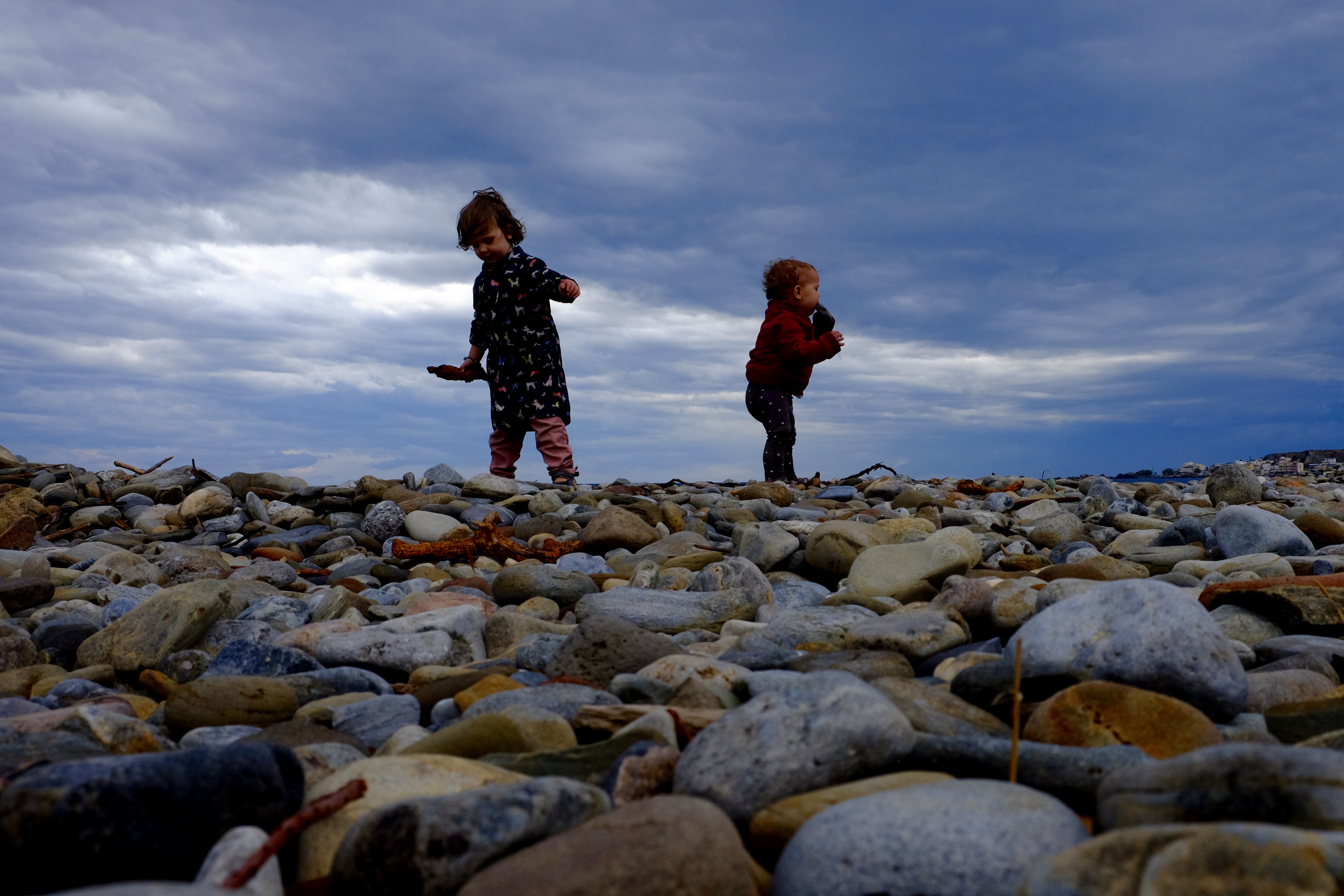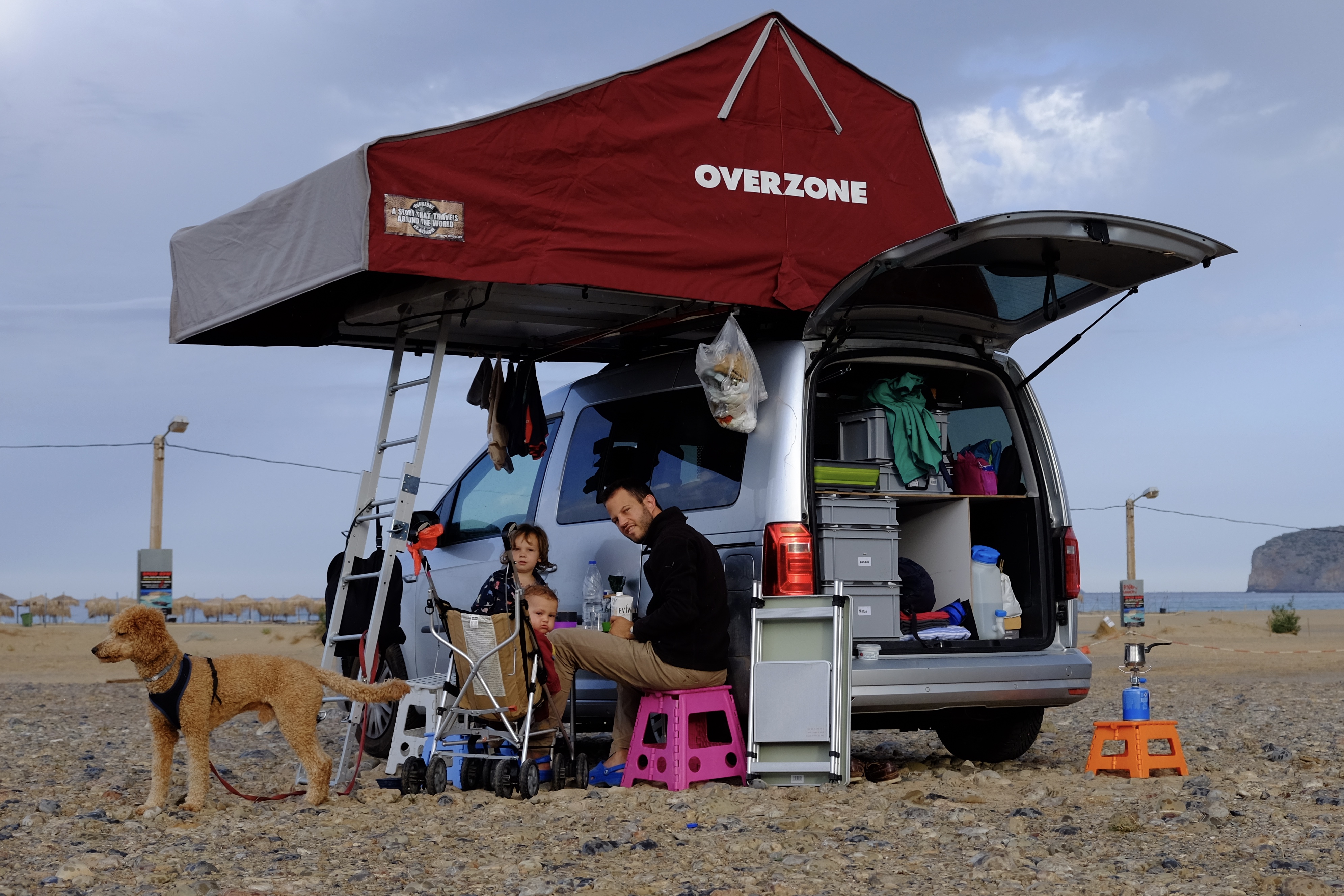 Wir klappen am Strand unser Dachzelt auf. Als die letzten Tagestouristen davonfahren, sind wir auf unserem Spaziergang fast ganz allein. Jetzt bläst ein kräftiger Westwind, der nicht nur Wellen ans Ufer, sondern auch dicke graue Wolken über den Himmel treibt. Wir haben unser Heckklappenzelt zuhause vergessen und der Boden ist so hart und steinig, dass gar nicht daran zu denken ist, unsere Spatz-Blache gegen Wind und Regen aufzustellen. Es gibt nur eins: Schnell kochen und hoffen, dass das Wetter hält, bis wir gegessen haben. Es hält. Und in der Nacht erweist sich das Dachzelt als ausserordentlich windtauglich. Draussen stürmt und bläst es, drinnen merken wir davon fast nur das Klackern der Reissverschlüsse.