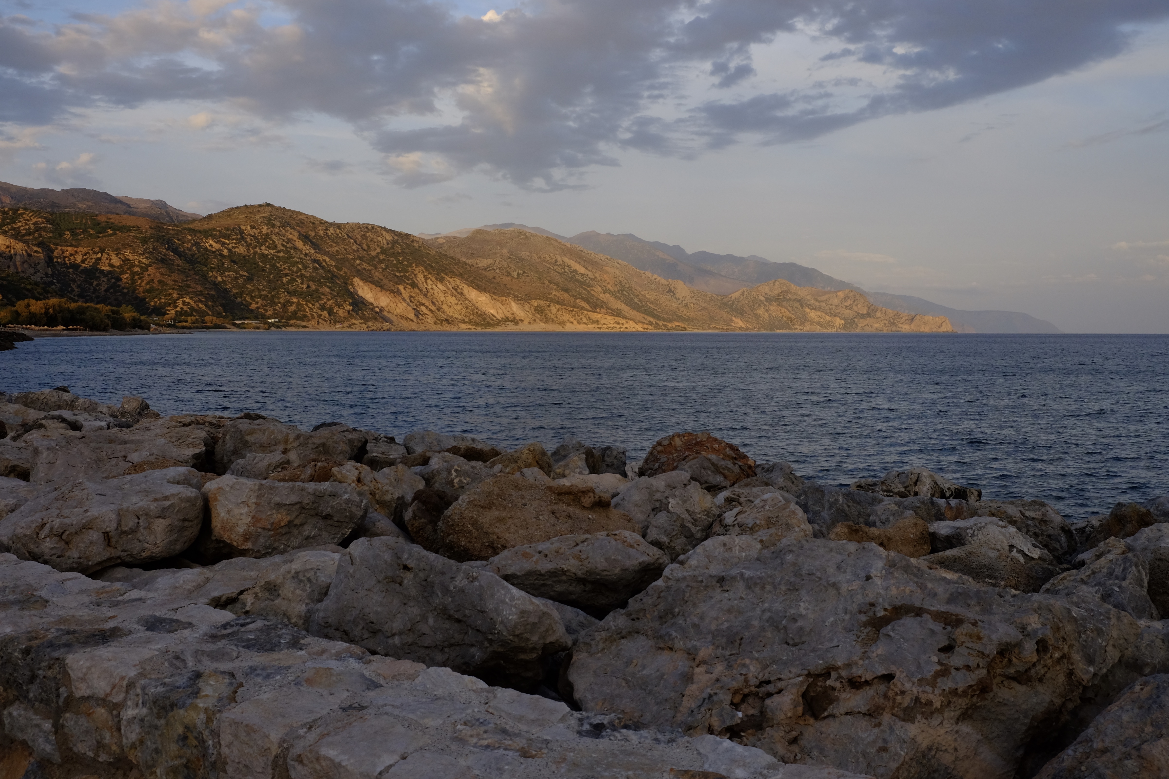 In der Taverne „Golden Sunset“ ganz am Ende des Dorfes essen wir ein frühes Zmittag. Vor vielen Jahren war ich oft hier, und der Ort ist immer noch unverändert schön: Eine gemütliche Terrasse, farbige Tische und Stühle unter den ausladenden Ästen zweier hoher Feigenbäume; der Blick über die ganze Bucht, aufs Meer und in weiter Ferne die Inseln Antikythira und Kythira.