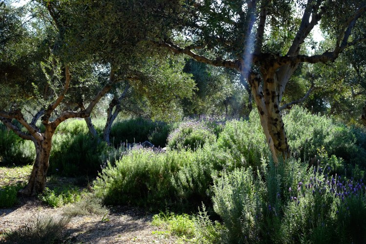 Ich gehe durch die Pforte und trete in den Garten von Vangelis Geronimakis. Nichts, was hier nicht wachsen würde! Der Ort ist eine Oase. Hohe, starke Olivenbäume, darunter üppiges Grün, durch das sich schmale Wege schlängeln, gleichzeitig Wildwuchs und Wohlordnung. Der Lavendel blüht schon, auch die Mandelbäume. Im Schatten der Oliven stehen in langen Reihen Kräuter– verschiedene Sorten Thymian, Majoran und Oregano, Petersilie, Rosmarin, Salbei und Diktamus, Johanniskraut und Currykraut. Geranien duften, die Zitronenbäumen tragen Früchte und stehen gleichzeitig bereits wieder in der Blüte.