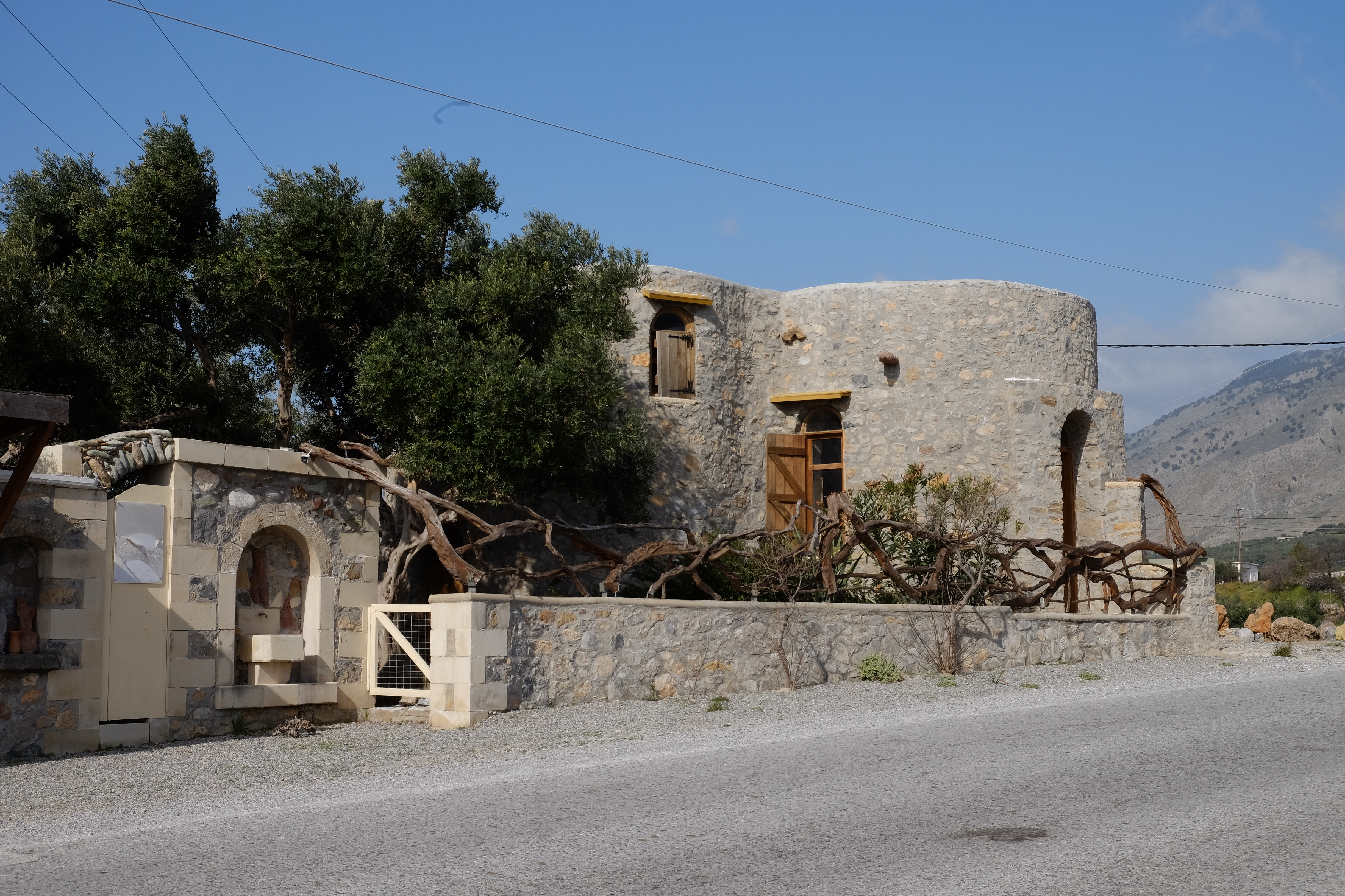 Als Vangelis das Land vor über dreissig Jahren übernahm, waren die Bedingungen für die Bewirtschaftung denkbar schlecht: Der Boden in der Gegend hier ist steinig und von Fels durchsetzt. Im Sommer brennt die Sonne erbarmungslos auf die Erde nieder, und nicht selten bläst der Nordwind mit sieben, acht Beaufort von den Bergen herab. Im Winter fällt oft heftiger Regen, der alles wegspült, was nicht tief in der Erde verwurzelt ist. Vangelis legte zuerst den Olivenhain an. Dann kamen die Kräuter hinzu, Obstbäume, Reben, Gemüse. Seit 2010 ist „Vagelis’ Farm“ als Botanischer Garten für Besucher zugänglich. Regelmässig kommen auch die lokalen Schulklassen mit ihren Lehrern in Vangelis’ Garten, um mehr über die kretische Pflanzenwelt zu erfahren. Zu der Anlage gehört auch ein Turm, in dem wechselnde Ausstellungen mit Skulpturen und Bildern stattfinden – zuletzt wurde etwa die Situation der Flüchtlinge auf den griechischen Inseln thematisiert.