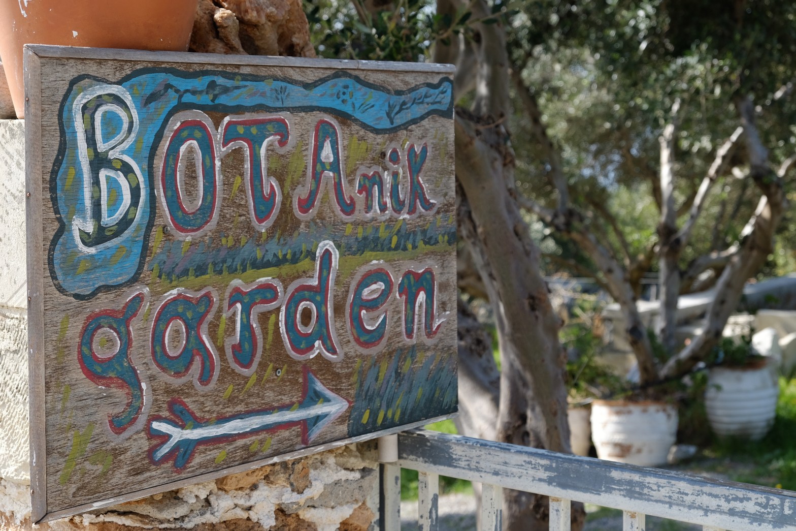 Als Vangelis das Land vor über dreissig Jahren übernahm, waren die Bedingungen für die Bewirtschaftung denkbar schlecht: Der Boden in der Gegend hier ist steinig und von Fels durchsetzt. Im Sommer brennt die Sonne erbarmungslos auf die Erde nieder, und nicht selten bläst der Nordwind mit sieben, acht Beaufort von den Bergen herab. Im Winter fällt oft heftiger Regen, der alles wegspült, was nicht tief in der Erde verwurzelt ist. Vangelis legte zuerst den Olivenhain an. Dann kamen die Kräuter hinzu, Obstbäume, Reben, Gemüse. Seit 2010 ist „Vagelis’ Farm“ als Botanischer Garten für Besucher zugänglich. Regelmässig kommen auch die lokalen Schulklassen mit ihren Lehrern in Vangelis’ Garten, um mehr über die kretische Pflanzenwelt zu erfahren. Zu der Anlage gehört auch ein Turm, in dem wechselnde Ausstellungen mit Skulpturen und Bildern stattfinden – zuletzt wurde etwa die Situation der Flüchtlinge auf den griechischen Inseln thematisiert.