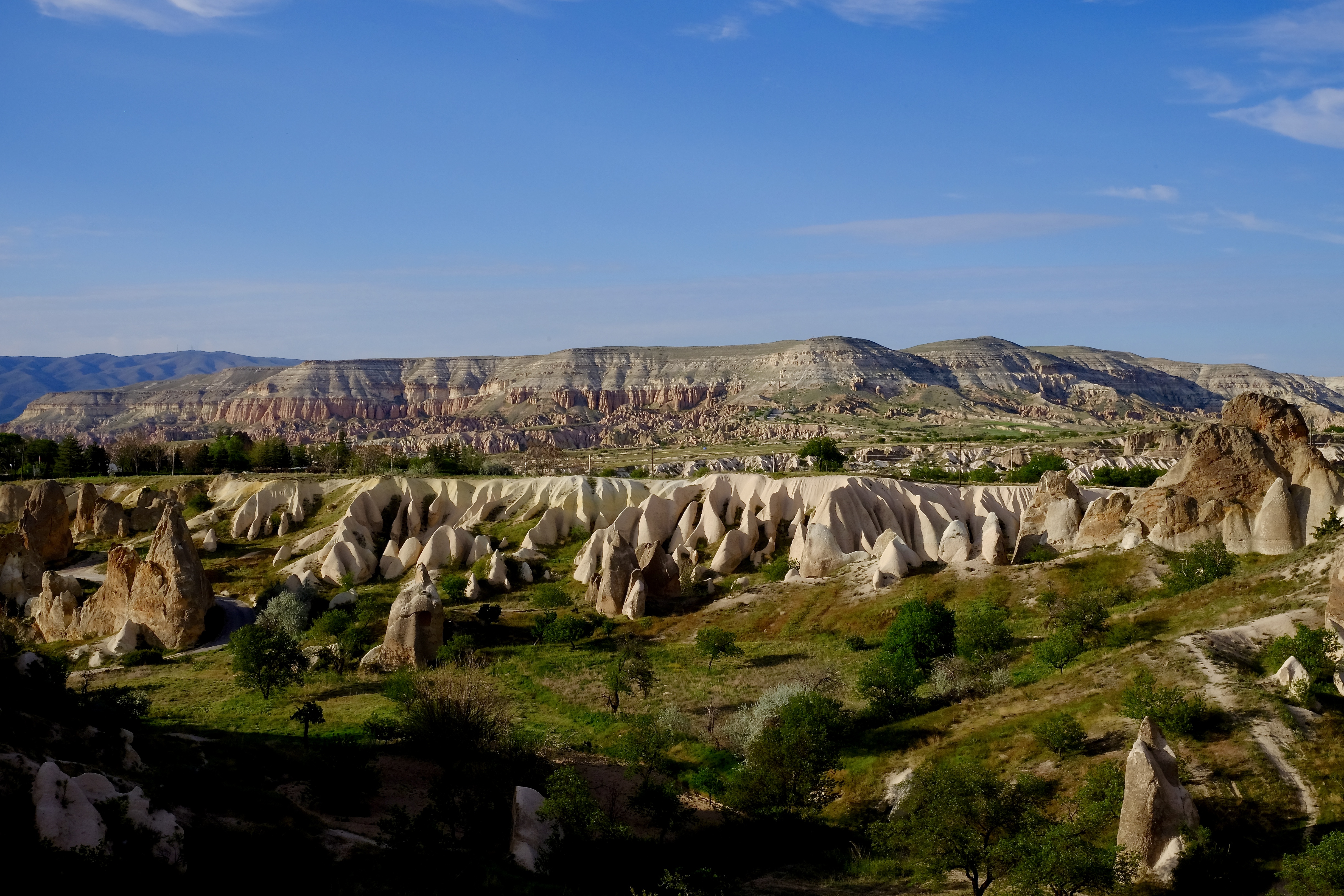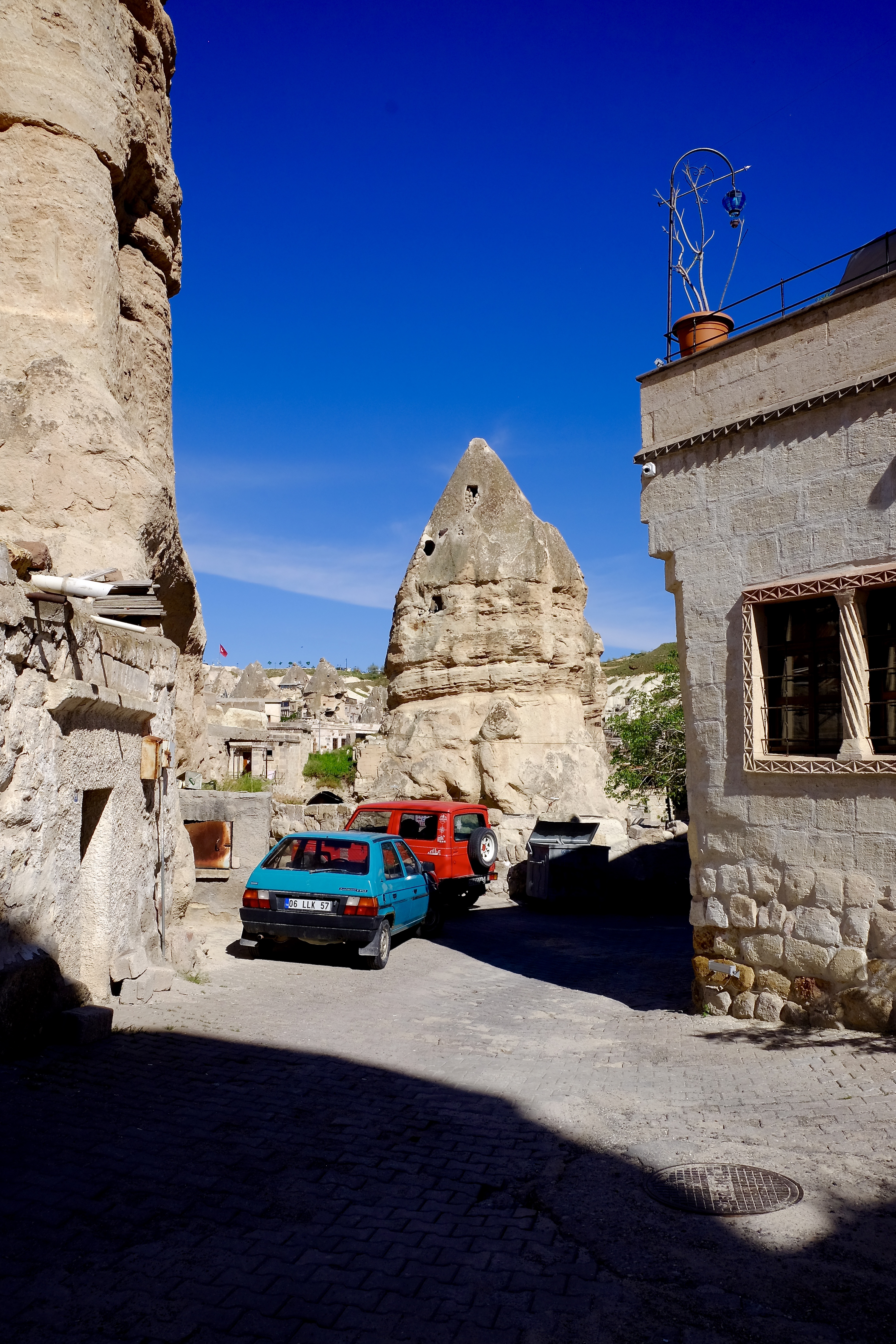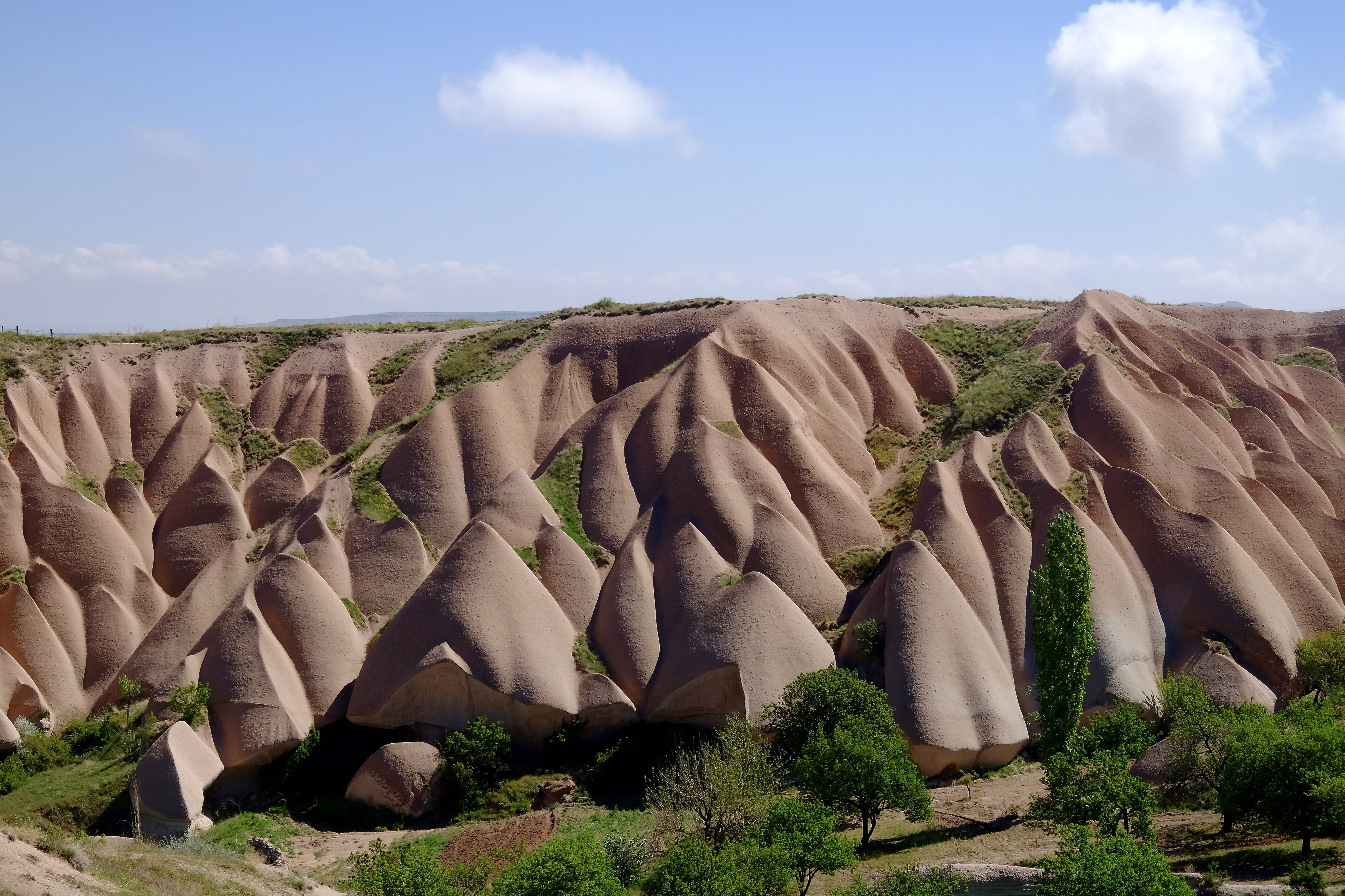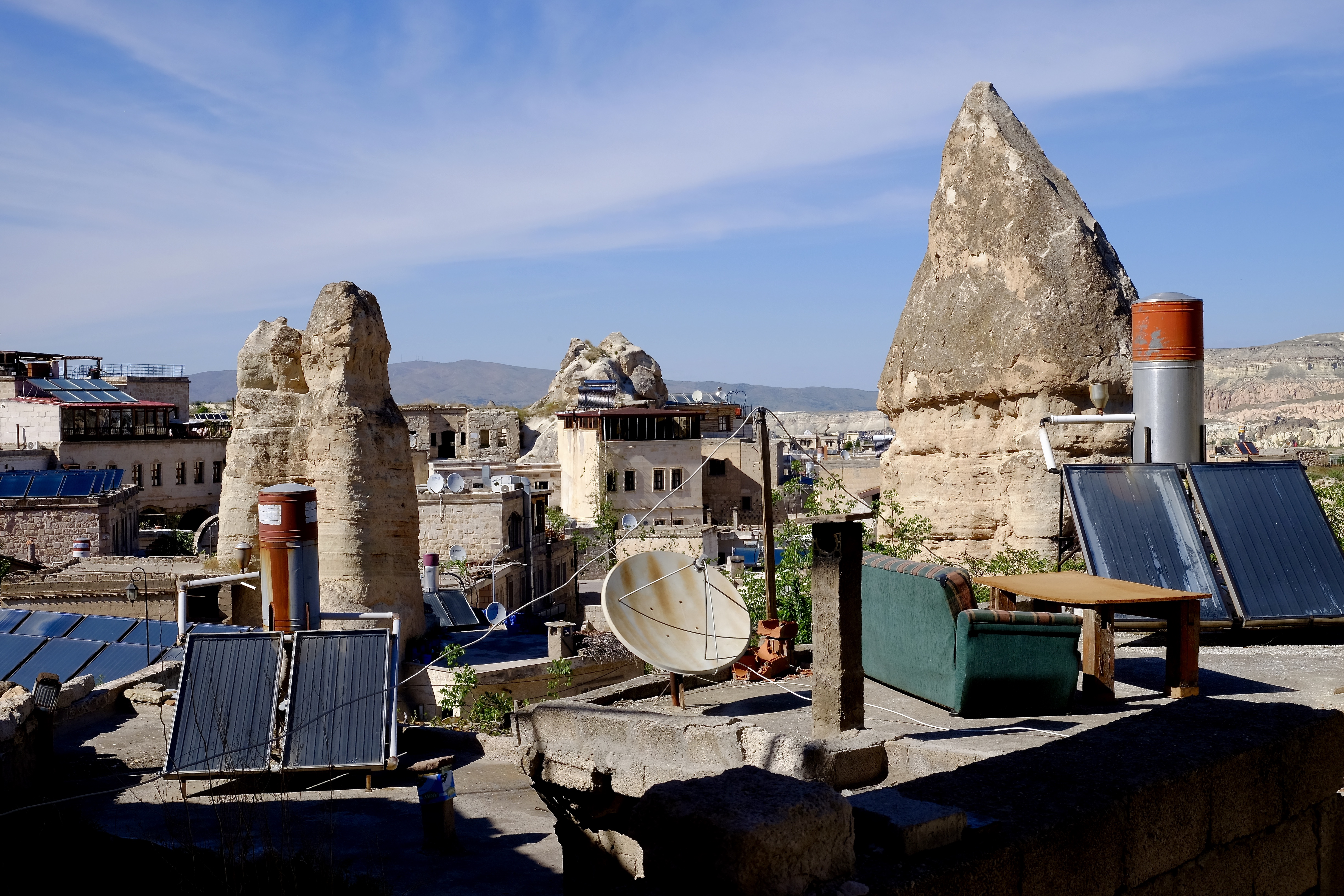Die Landschaft, durch die wir fahren, ist unglaublich. Wohin man auch schaut, stehen Tuffsteinkegel und -säulen in fast jeder vorstellbaren Form und schroff abgebrochene Felswände, und sie sind allesamt durchlöchert wie ein Emmentaler Käse. Türen, Fenster und Balkone, manche ebenerdig, andere hoch oben am Felsen. Wir müssen ganz langsam fahren, weil es so viel zu sehen gibt. Die Einheimischen erkennen Neuankömmlinge wohl am Fahrtempo.