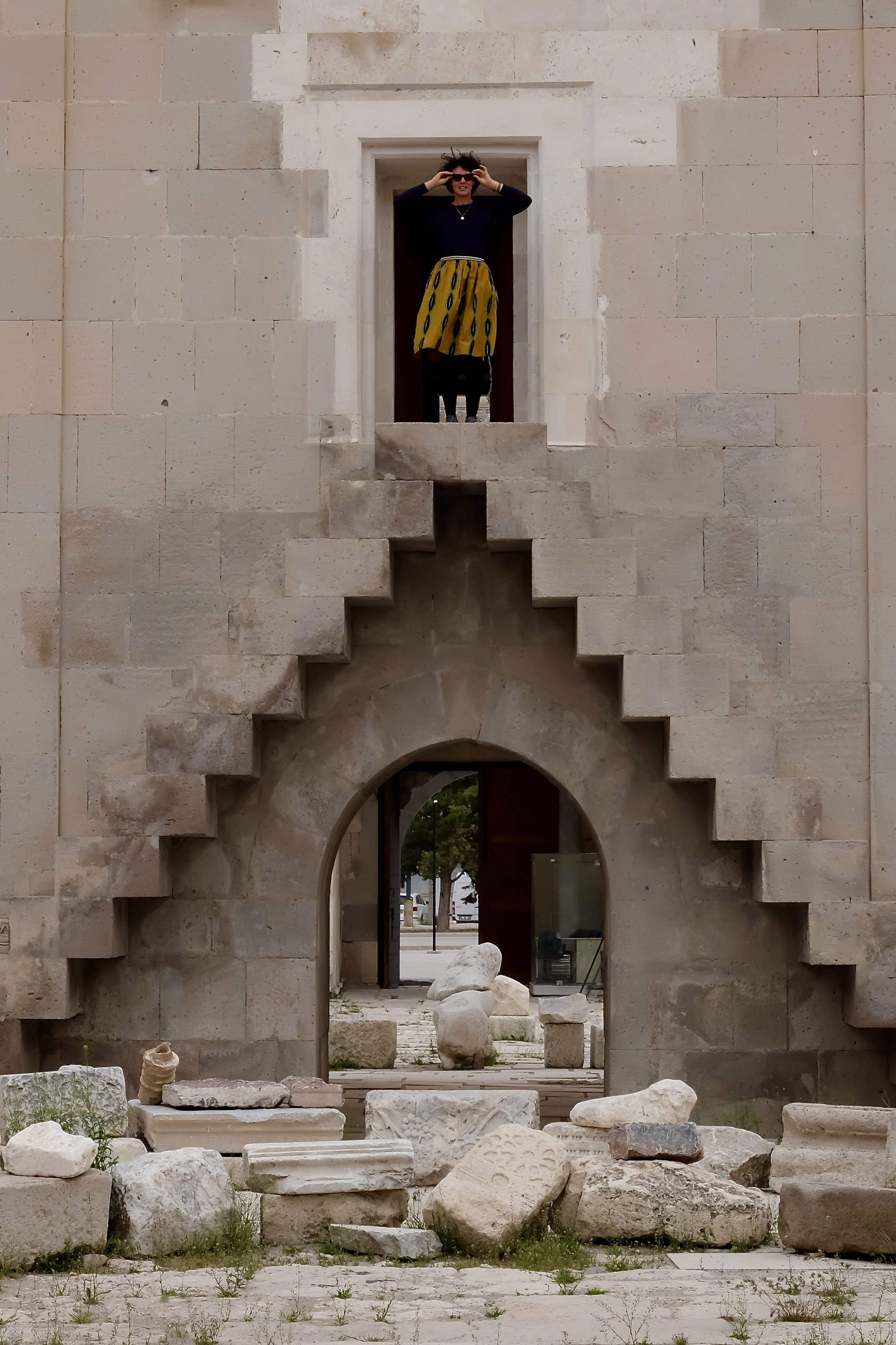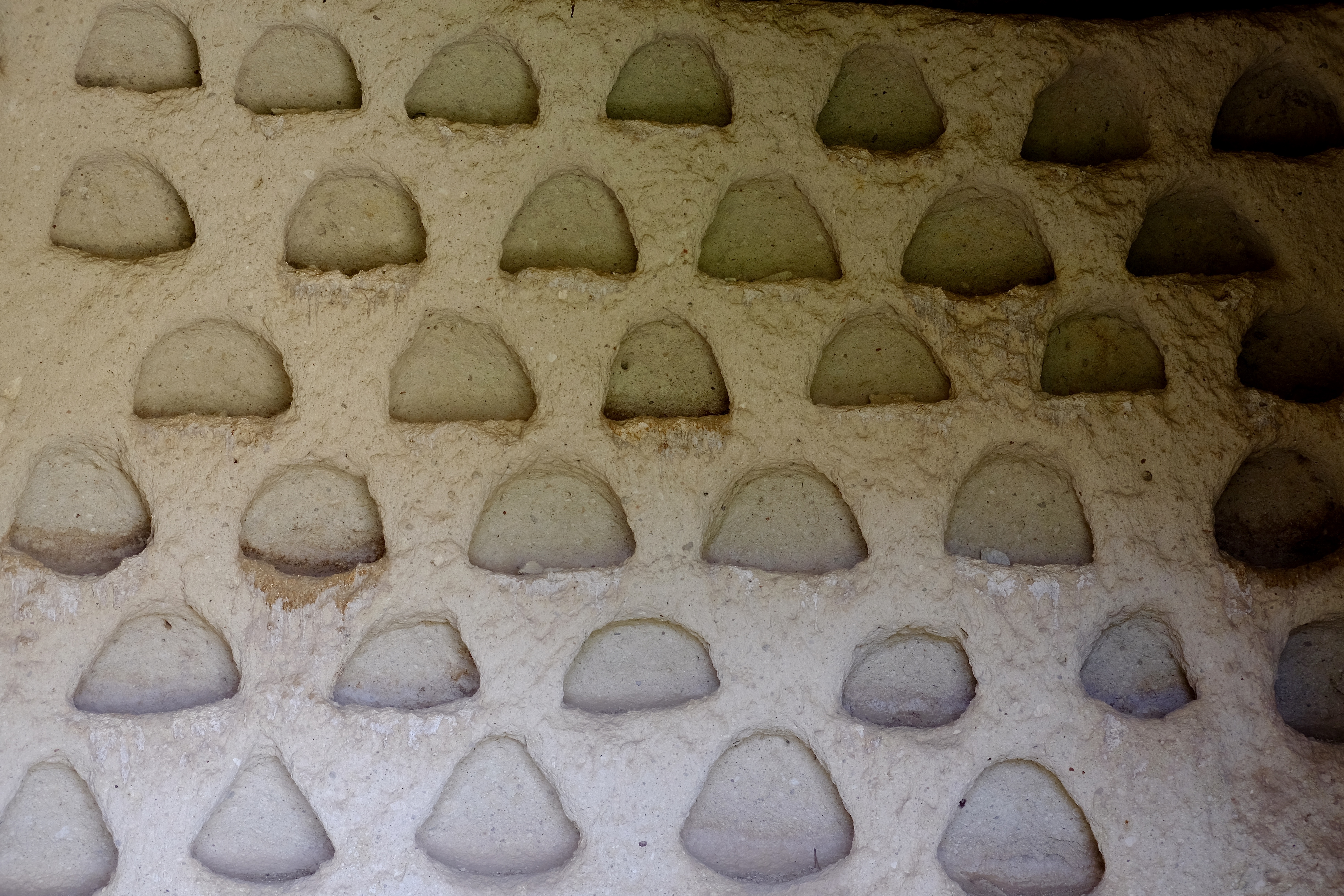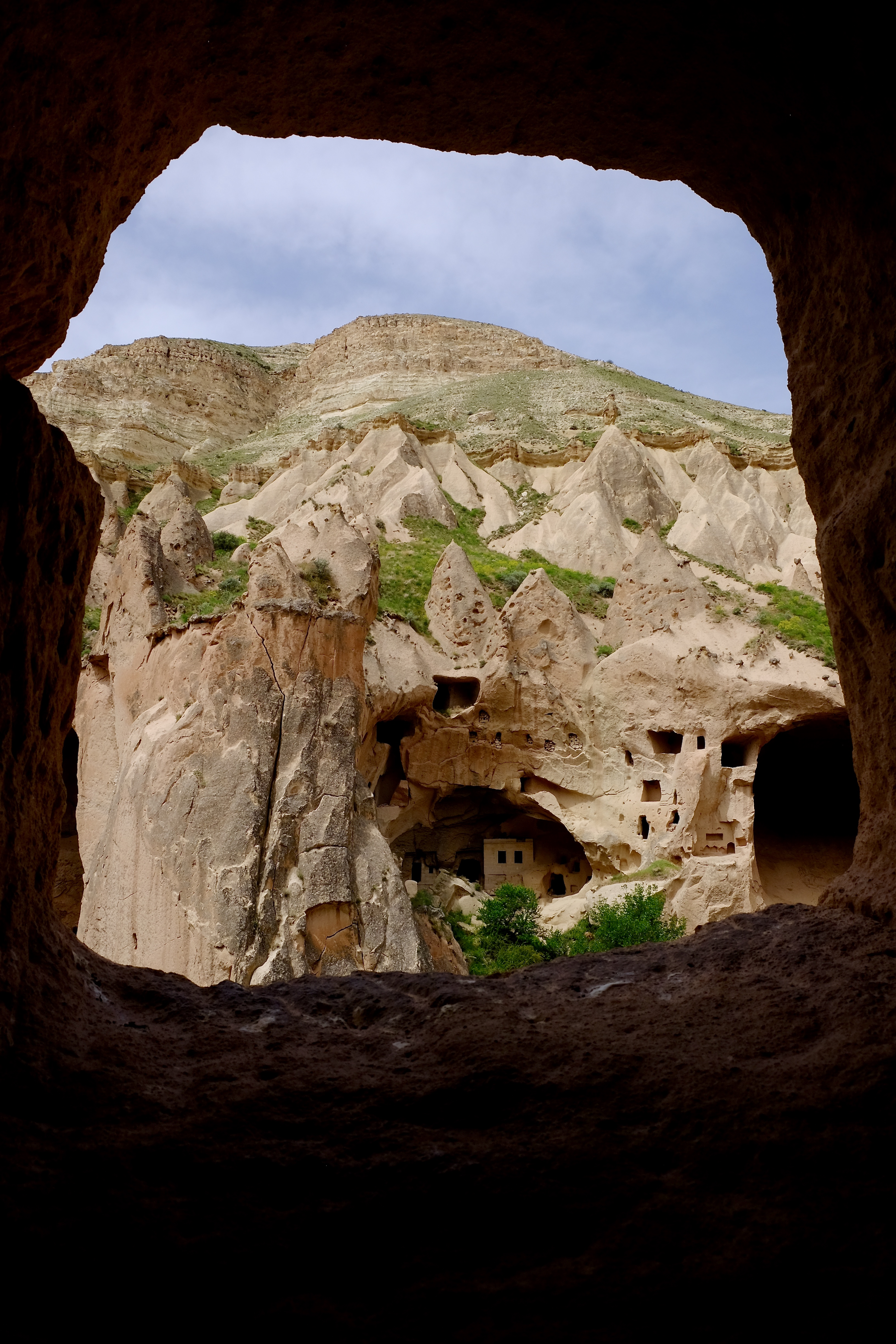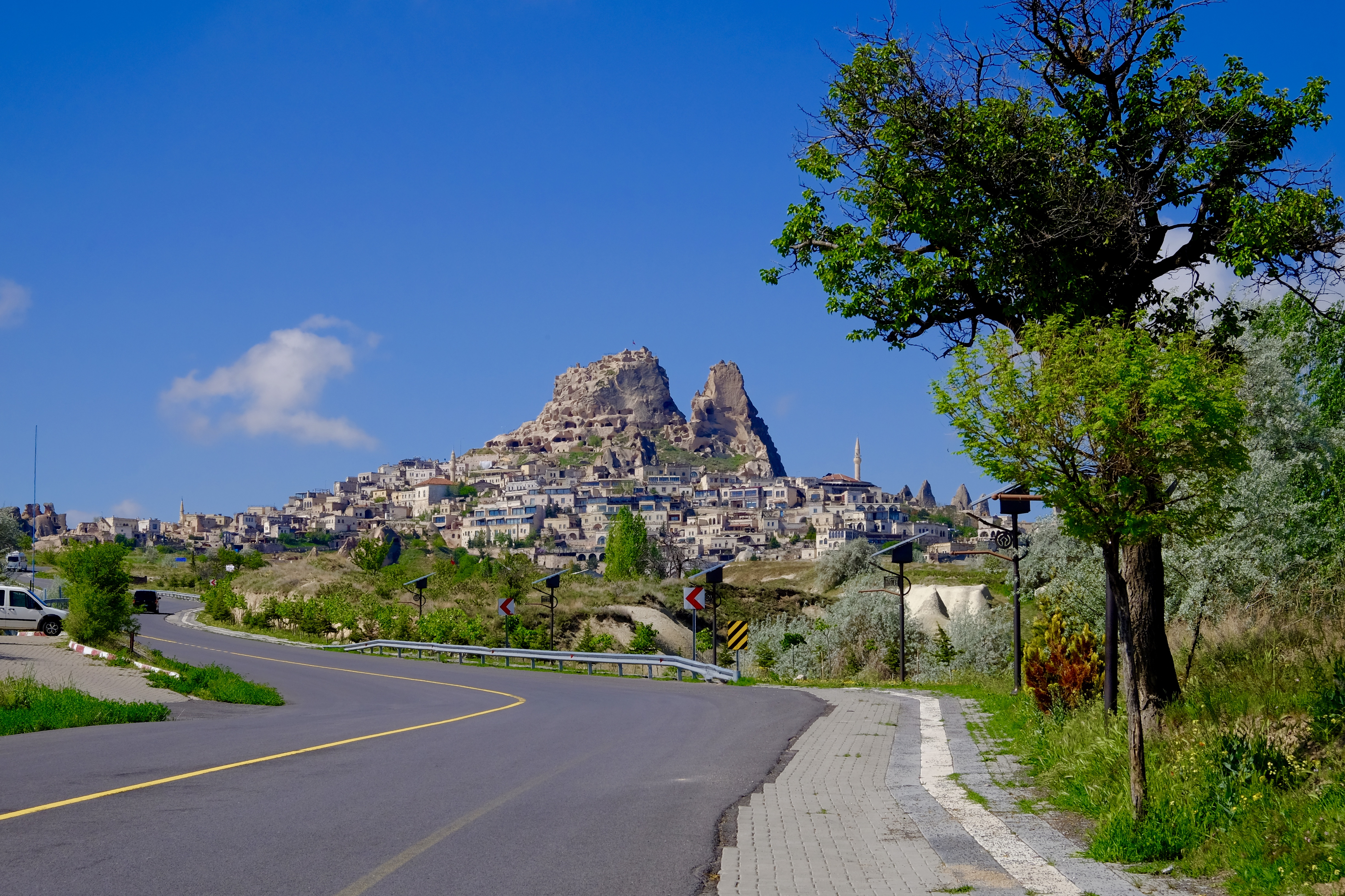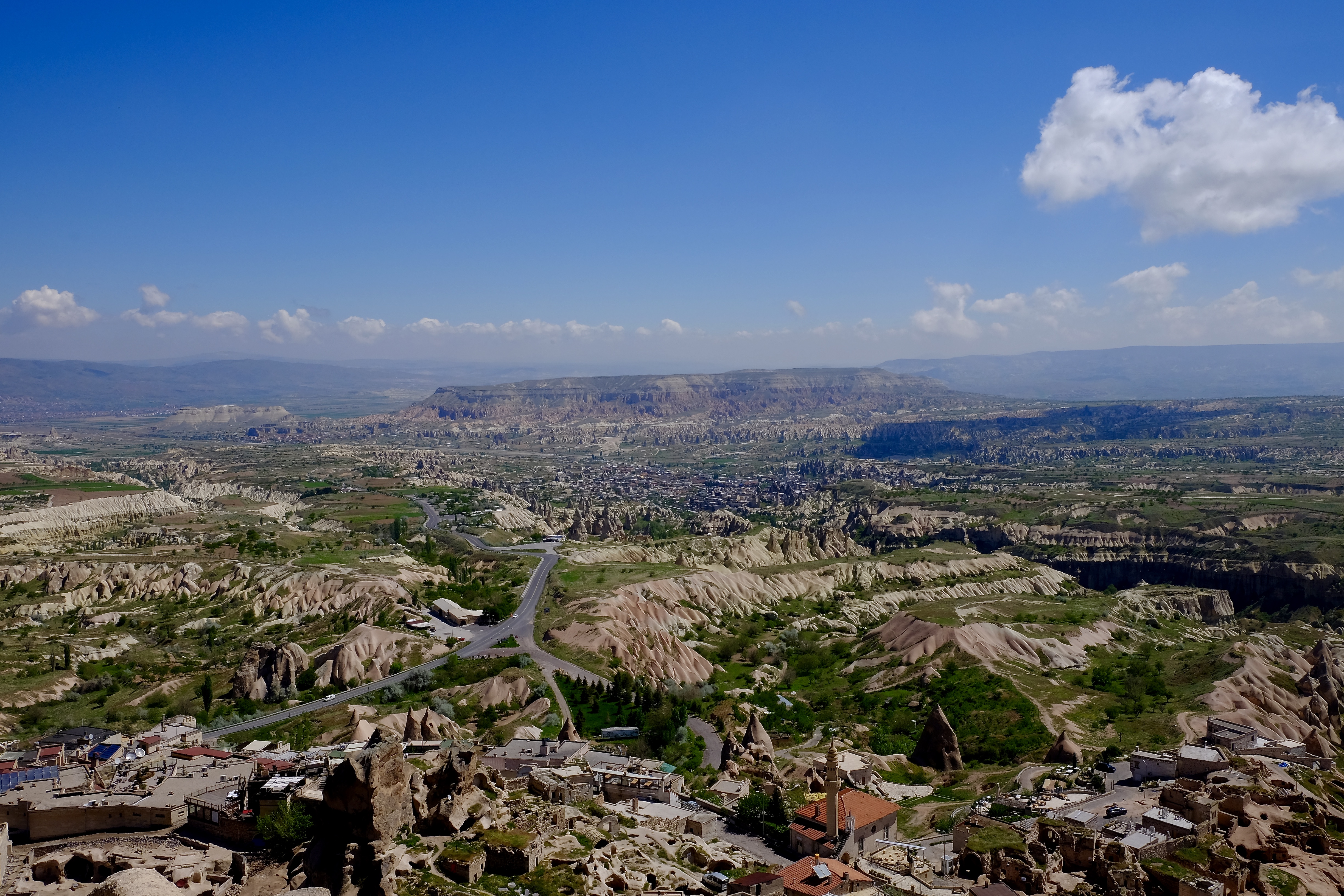 Die Landschaft, durch die wir fahren, ist unglaublich. Wohin man auch schaut, stehen Tuffsteinkegel und -säulen in fast jeder vorstellbaren Form und schroff abgebrochene Felswände, und sie sind allesamt durchlöchert wie ein Emmentaler Käse. Türen, Fenster und Balkone, manche ebenerdig, andere hoch oben am Felsen. Wir müssen ganz langsam fahren, weil es so viel zu sehen gibt. Die Einheimischen erkennen Neuankömmlinge wohl am Fahrtempo.