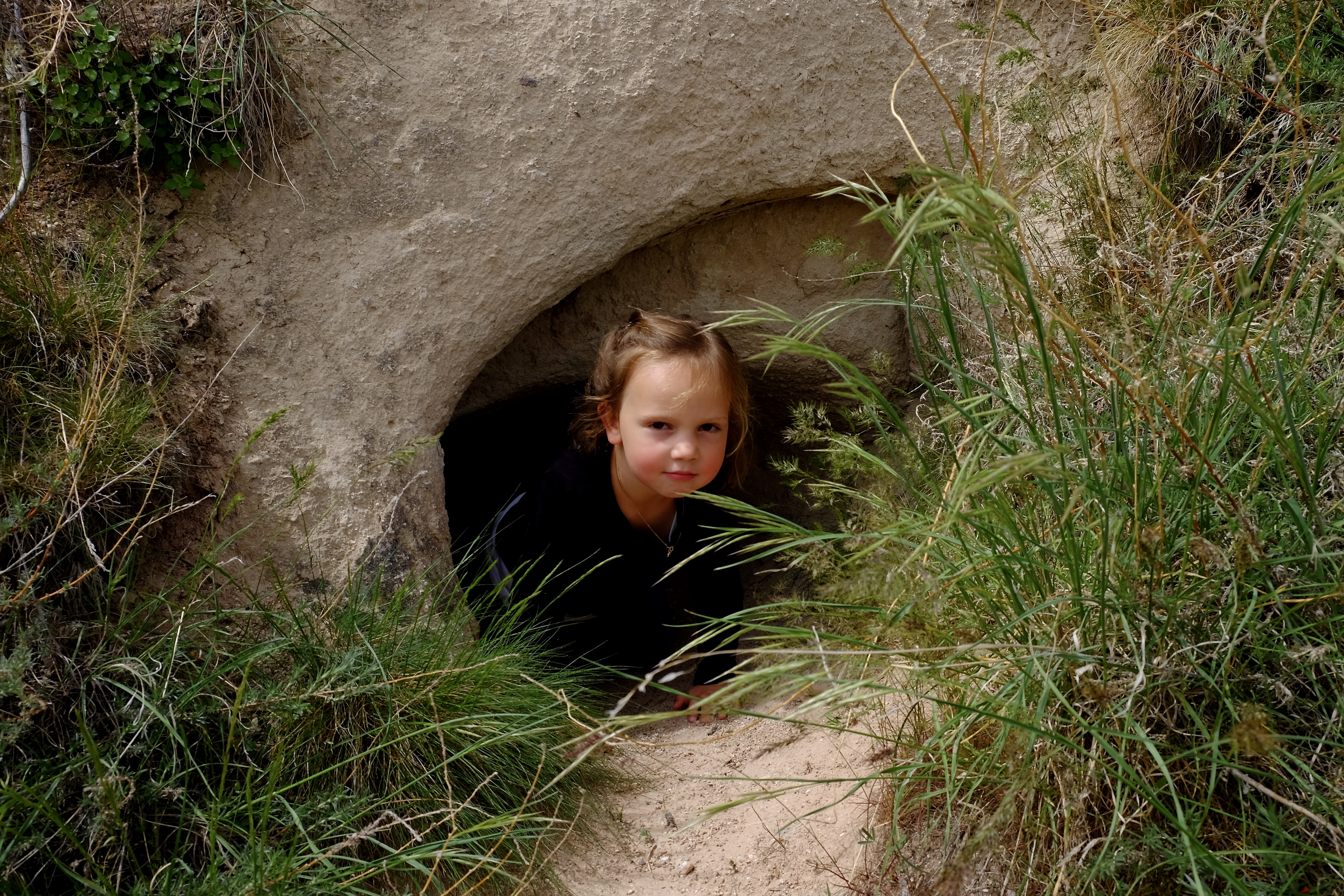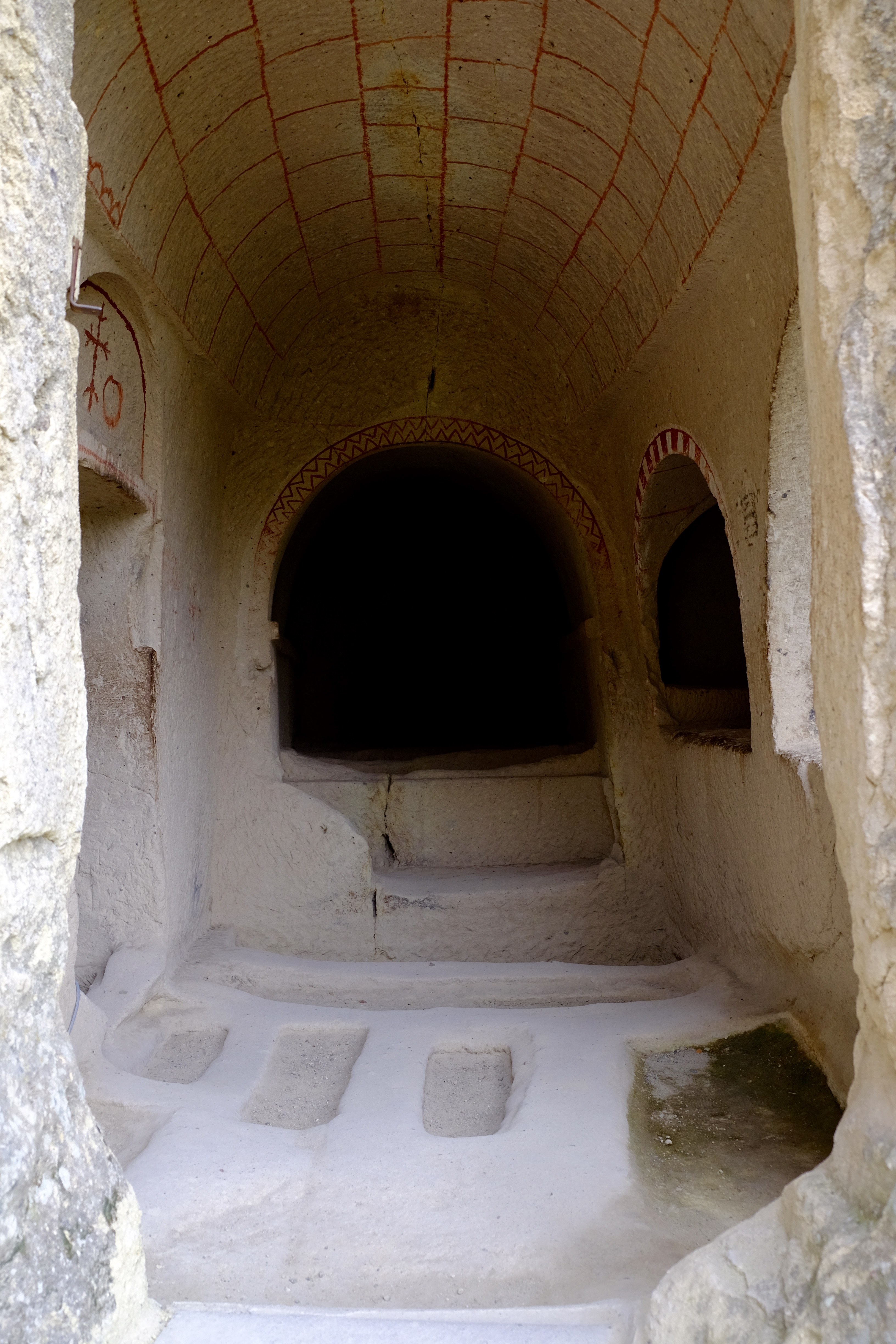 Sobald wir alle wieder einigermassen munter sind, erkunden wir die Umgebung. Mehrere Tage lang klettern wir in alle möglichen und unmöglichen Löcher, tummeln uns durch alte Klosterküchen und -refektorien (Esssäle), in Stallhöhlen und durch Kirchen mit tausendjährigen, wunderbar erhaltenen Fresken, die einem den Atem rauben. Rund um die Kirchen gibt es oft Grabanlagen, in den Fels geschlagene Kammern, wo die Verstorbenen bestattet wurden. Immer wieder sehen wir auch ganz kleine Vertiefungen, wo vermutlich Bébés oder Kleinkinder beerdigt wurden. Das gibt besonders Rosa sehr zu denken.