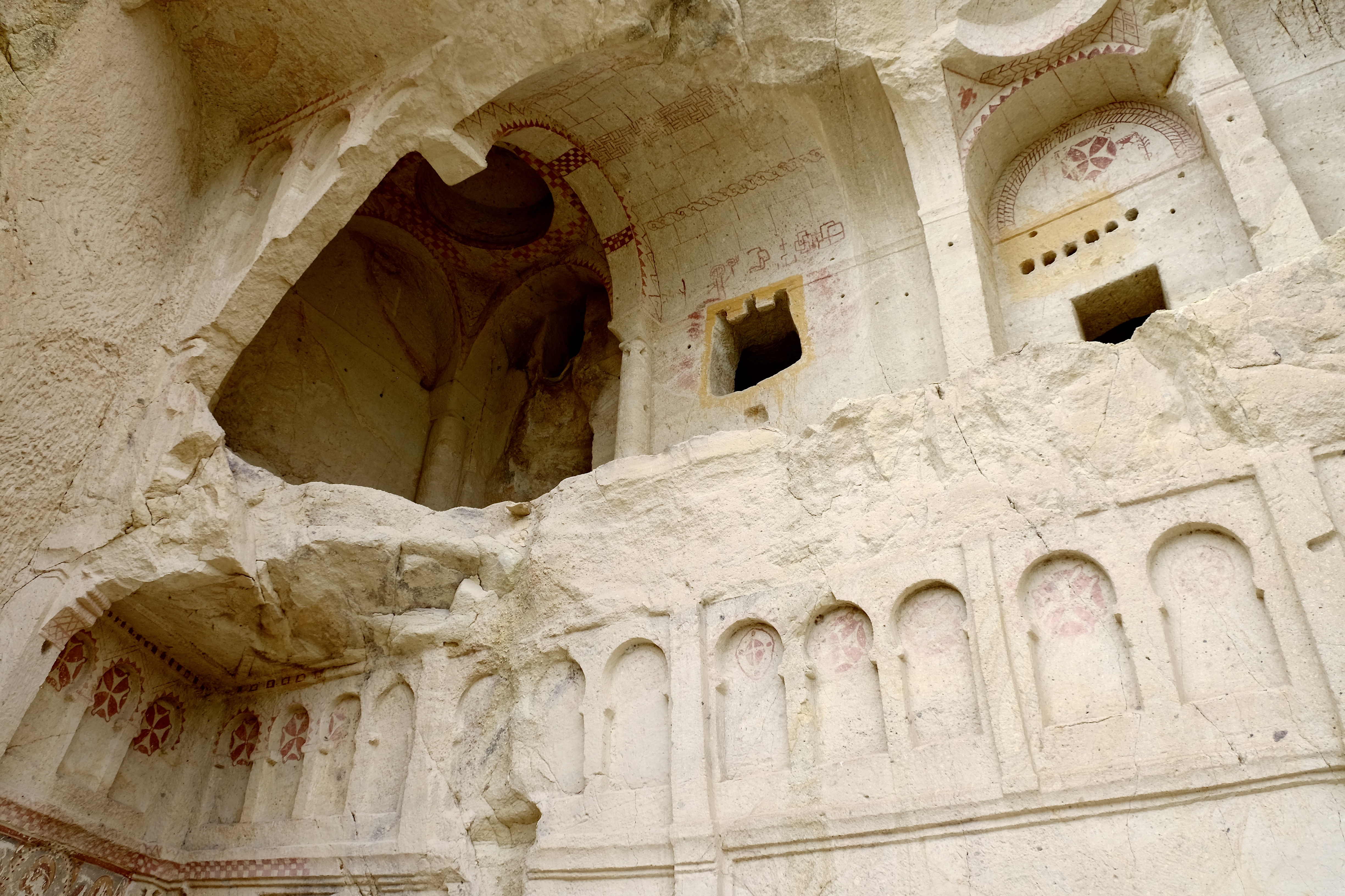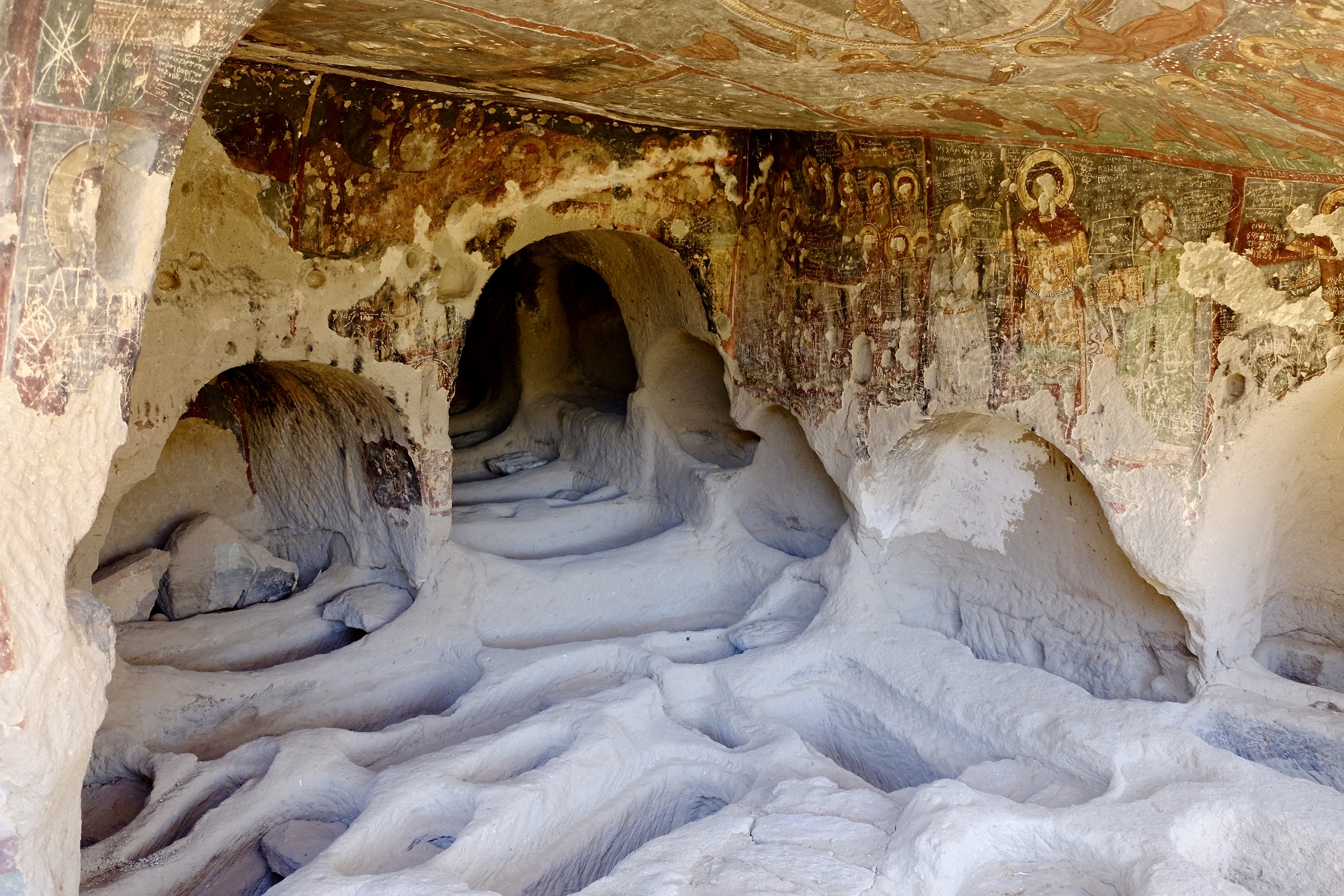 Doch sogar Felsen und Steine sind in Bewegung. An vielen Stellen im Tal kann man sehen, wie mächtige Brocken abgebrochen und ins Tal gestürzt sind. Durch manch eine Kirche laufen tiefe Risse, es klaffen Löcher in den Wänden oder es fehlen ganze Teile. Überall ist – ganz wörtlich – Zerfall zu erkennen. So werden die kappadokischen Höhlenkirchen, einst für die Ewigkeit in Stein gemeisselt, auch zu einem Sinnbild für die Vergänglichkeit.