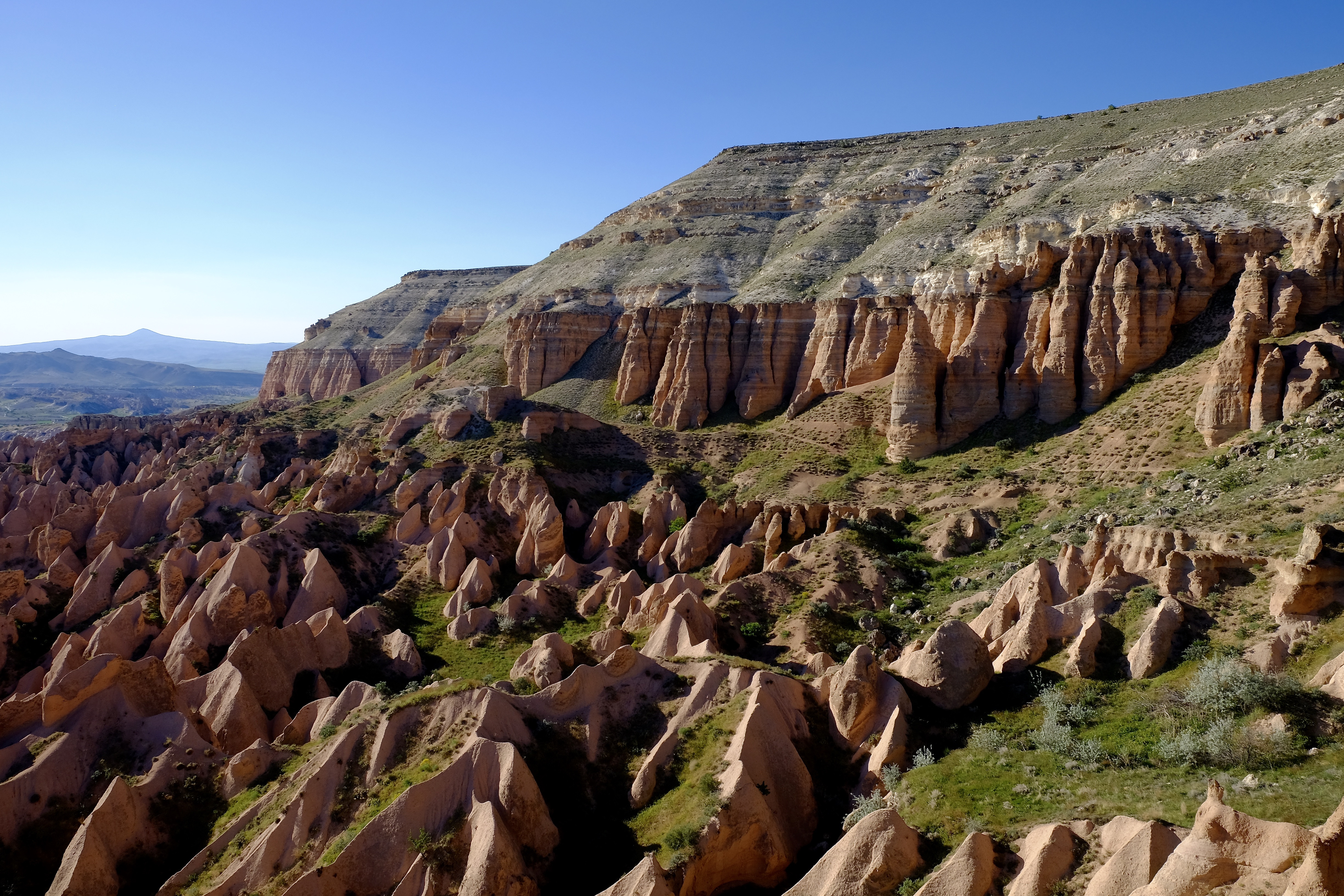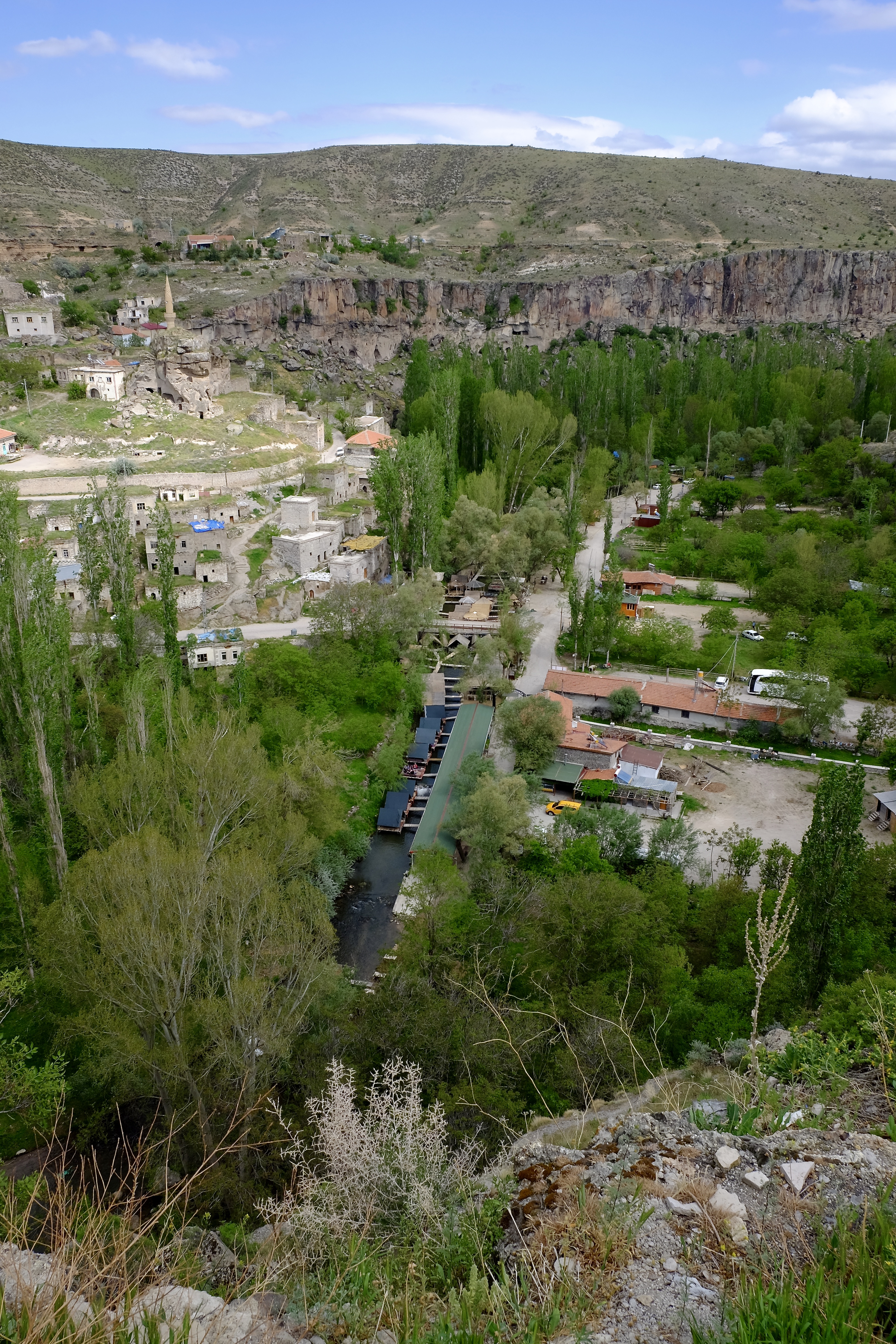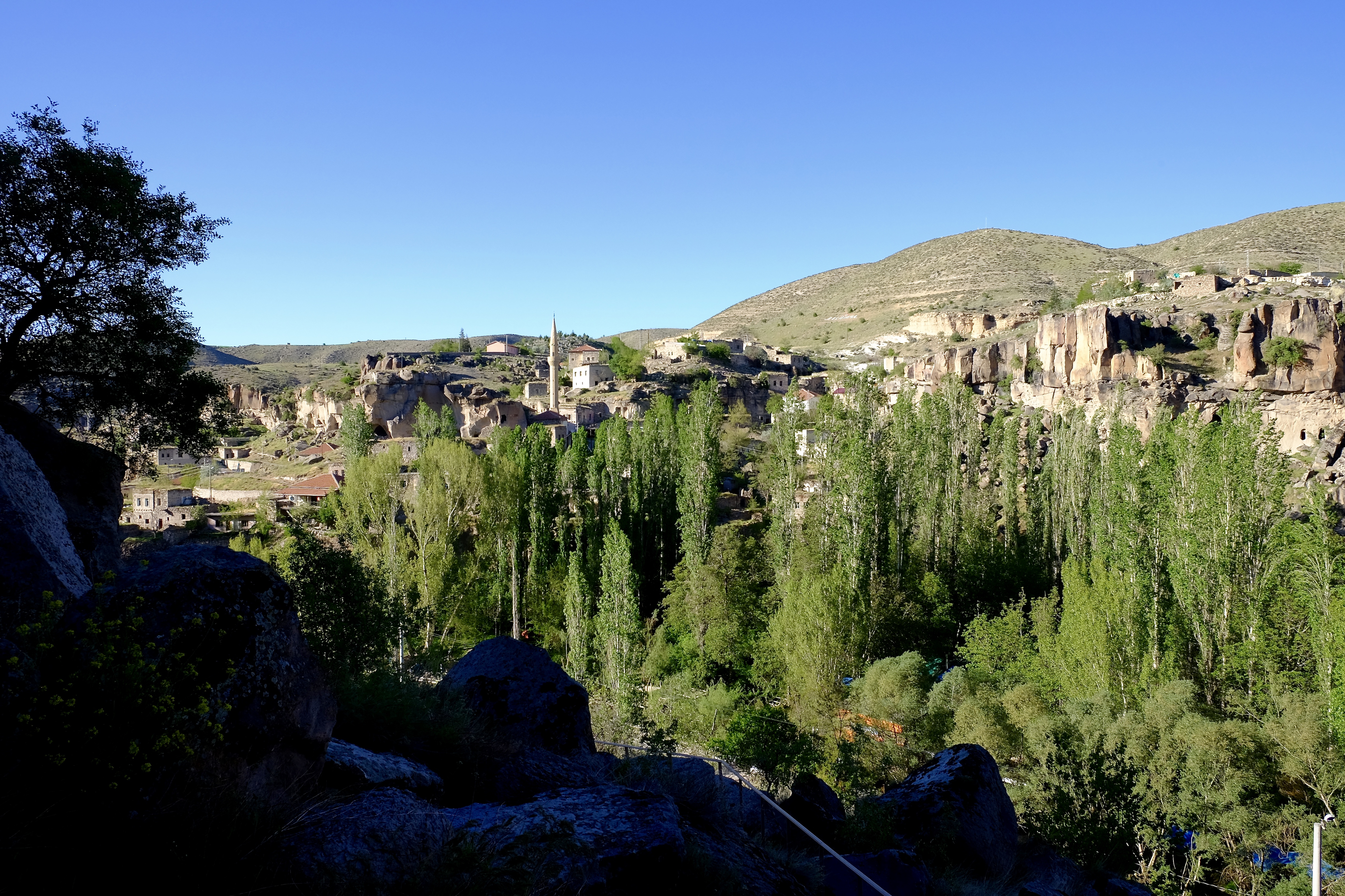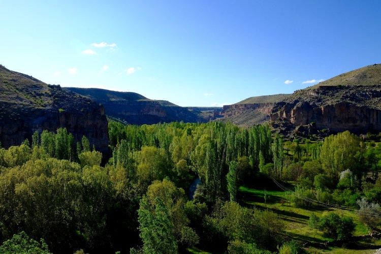 Nach den Nächten im Hotel ist es wieder Zeit fürs Dachzelt. Unser nächstes Ziel ist das Ihlara-Tal. Nur – wo ist es? Die Strasse führt über sanft geschwungene und fast kahle Hügel. Am Horizont erhebt sich majestätisch der Hasan Dağı, ein erloschener, über 3000 Meter hoher Vulkan. Doch hier? Keine Spur von einem Tal. Wir sehen es erst, als wir direkt darauf zu fahren: Neben der Strasse tut sich ein Abgrund auf. Mitten durch diese karge Landschaft zieht sich ein breiter Riss, die Felsen fallen senkrecht ab, und tief, tief unten am Talgrund fliesst zwischen üppigem Grün und hohen Pappeln ein Bach.
