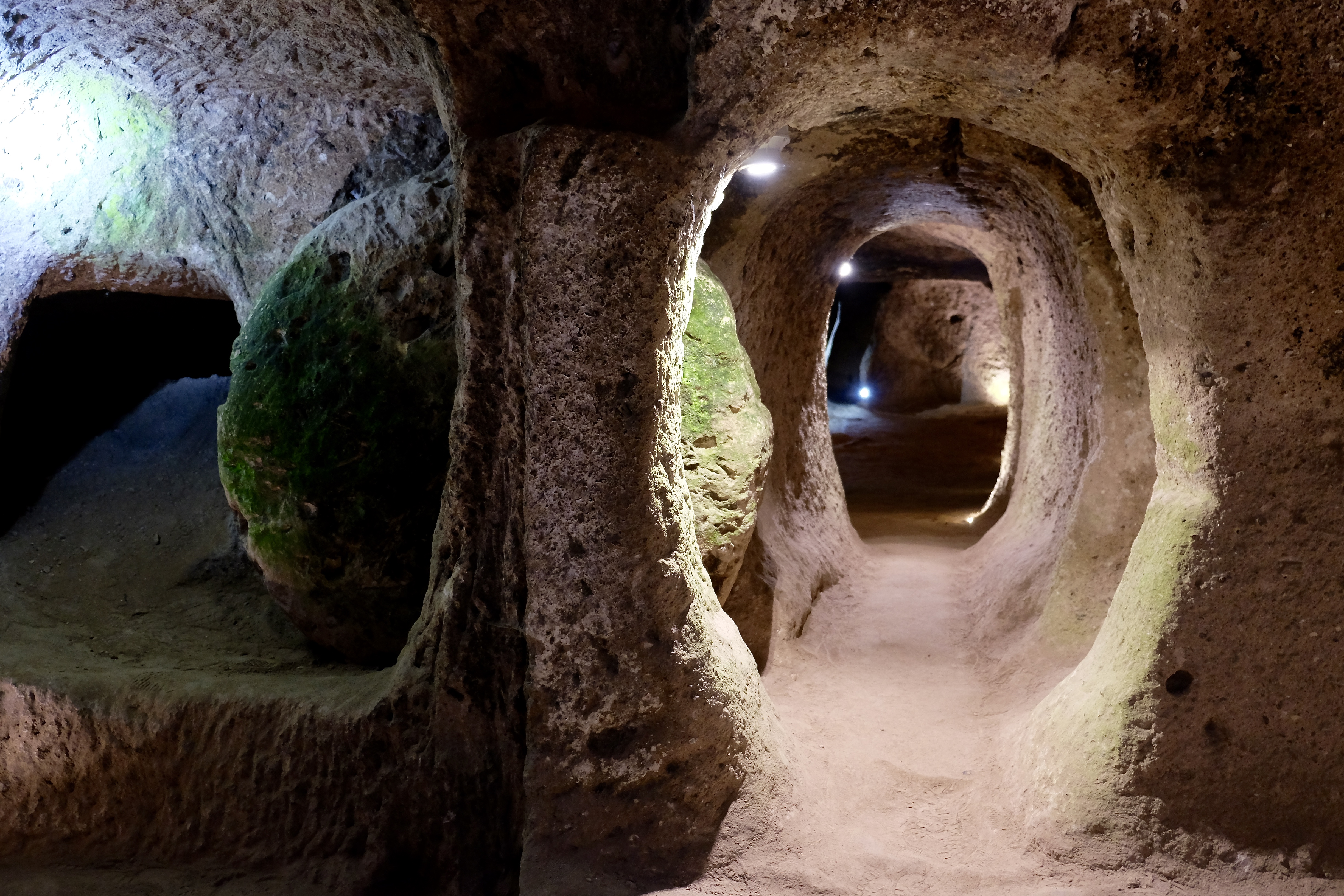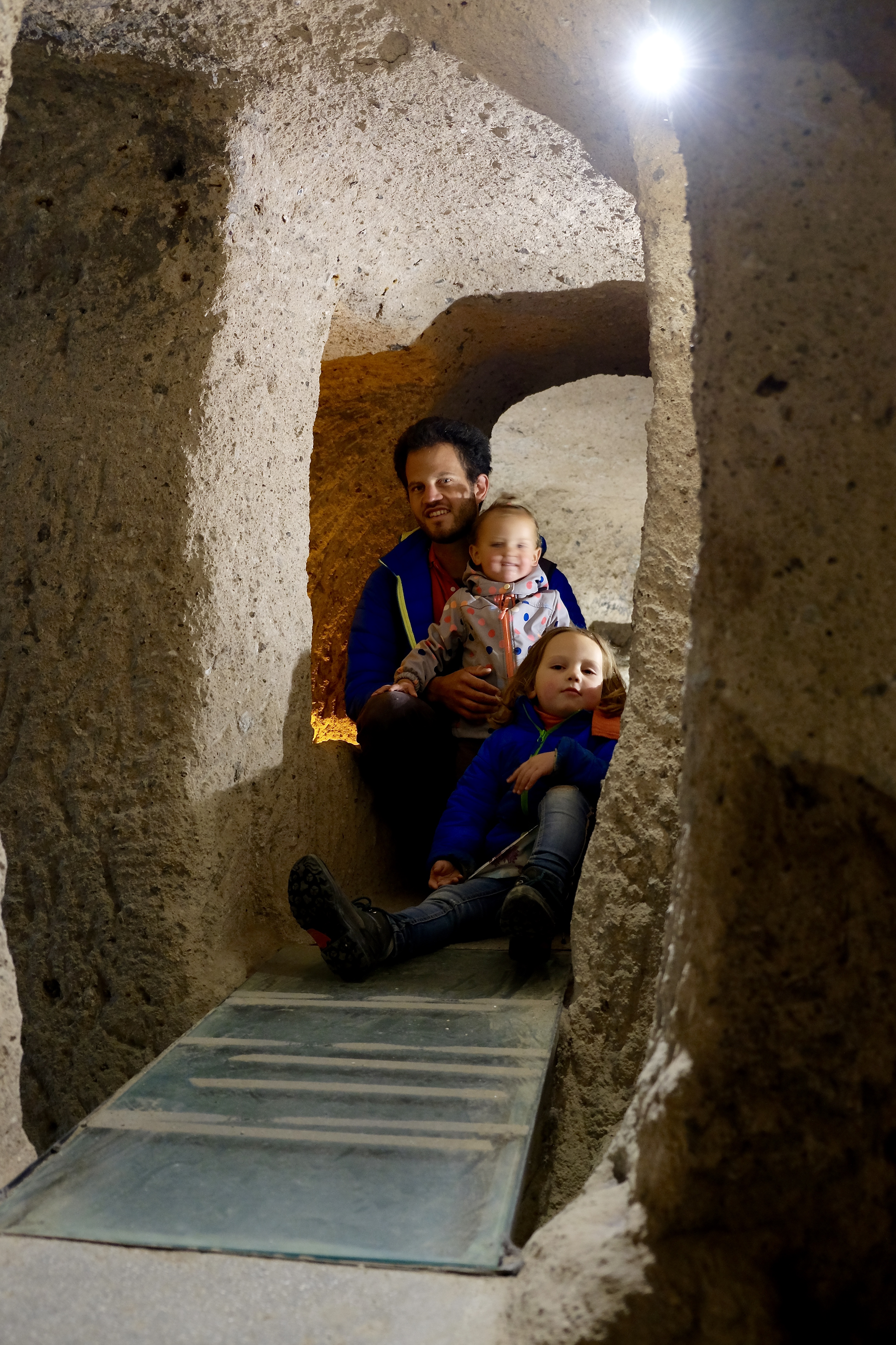 Auf der Weiterfahrt machen wir Halt in Kaymakli. Mitten auf einer topfebenen Fläche bauten Menschen vor gut tausend Jahren eine Stadt – nicht auf, sondern unter der Erde! Es ist eine von mehreren hundert unterirdischen Städten in Kappadokien. Wir folgen den roten Pfeilen und geraten durch Gänge und über Treppen und Stege immer weiter unter den Boden. Es ist faszinierend und auch ein wenig unheimlich – besonders wenn man daran denkt, dass nur ein kleiner Teil dieses Höhlenlabyrinths überhaupt erforscht und erschlossen ist. Irgendwann, als es sich schon nach sehr tief unten anfühlt, gibt eine Luke in der Wand den Blick in einen Lüftungsschacht frei – noch viele, viele Stockwerke weiter unten verliert sich das Rohr in bodenlosem Schwarz.