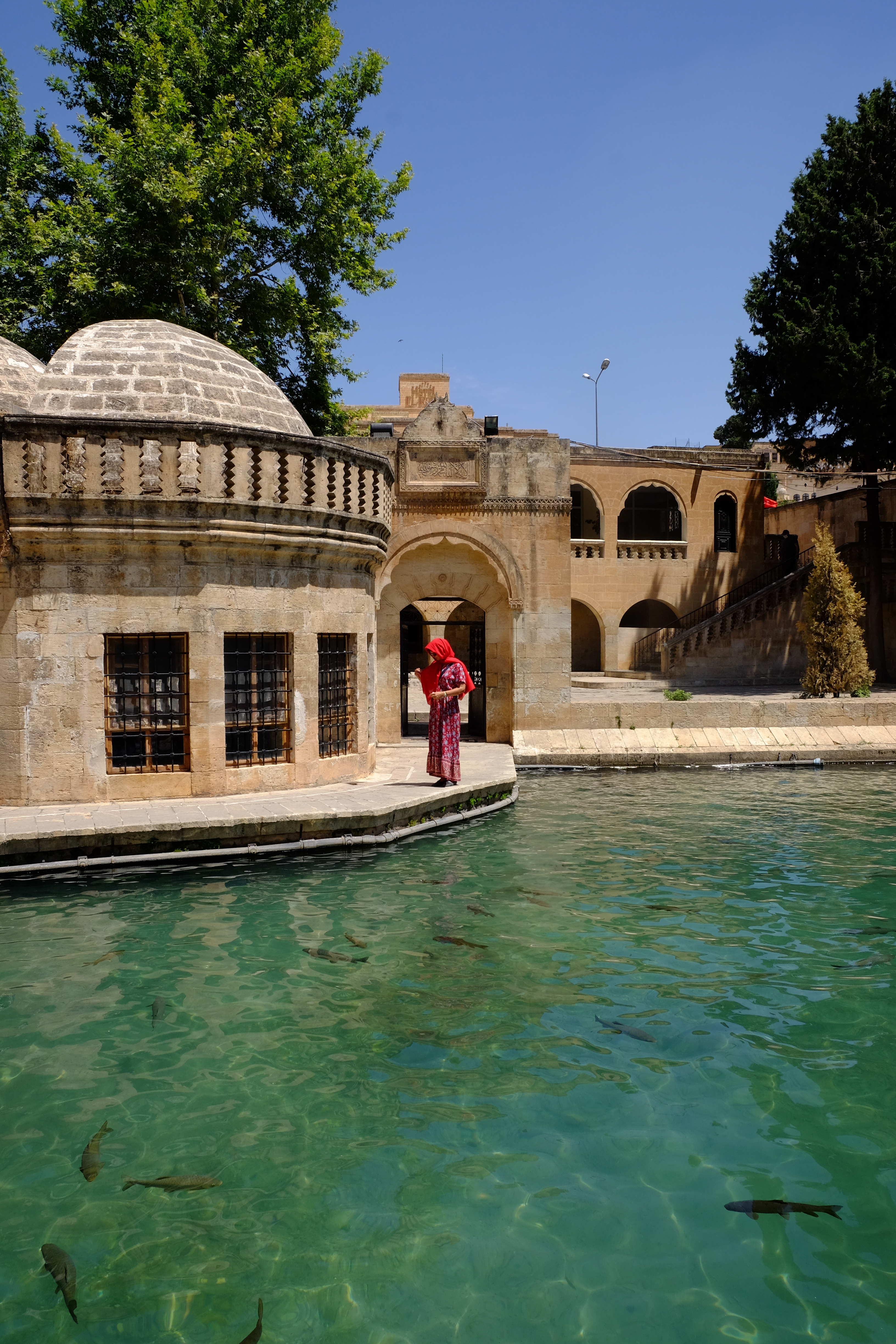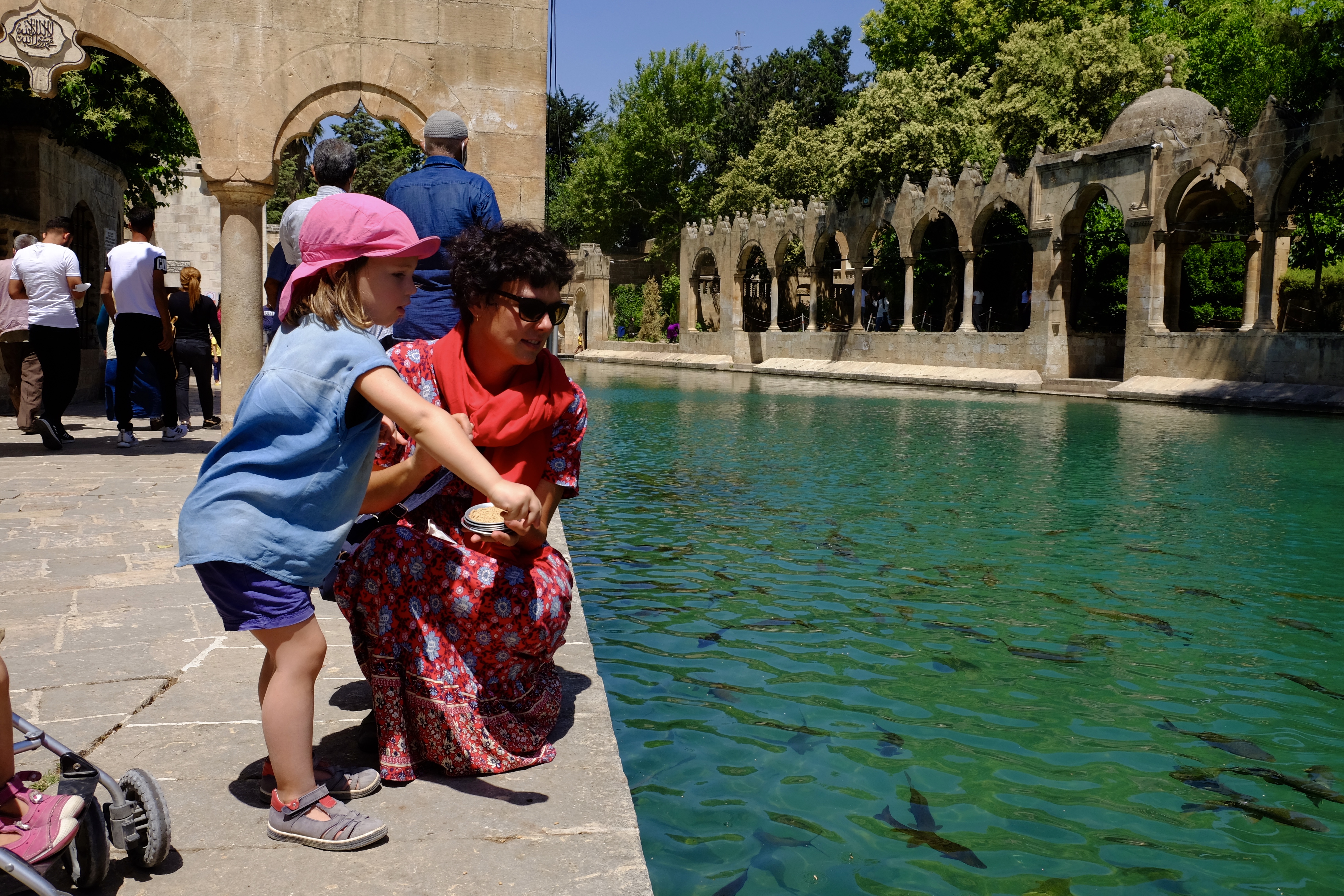 In einem gewaltigen Teich tummeln sich Fische – es sind heilige Karpfen. Der Legende nach sollte Abraham hier auf einem Scheiterhaufen sterben, doch Gott rettete ihn, indem er das Feuer in Wasser und die Glutbrocken in Fische verwandelte. Wie alle anderen Besucher kaufen wir am Kiosk Futter, das Rosa und Stella vergnügt an die Karpfen verfüttern. Und ich frage mich, ob sich Fische eigentlich auch überessen können.
