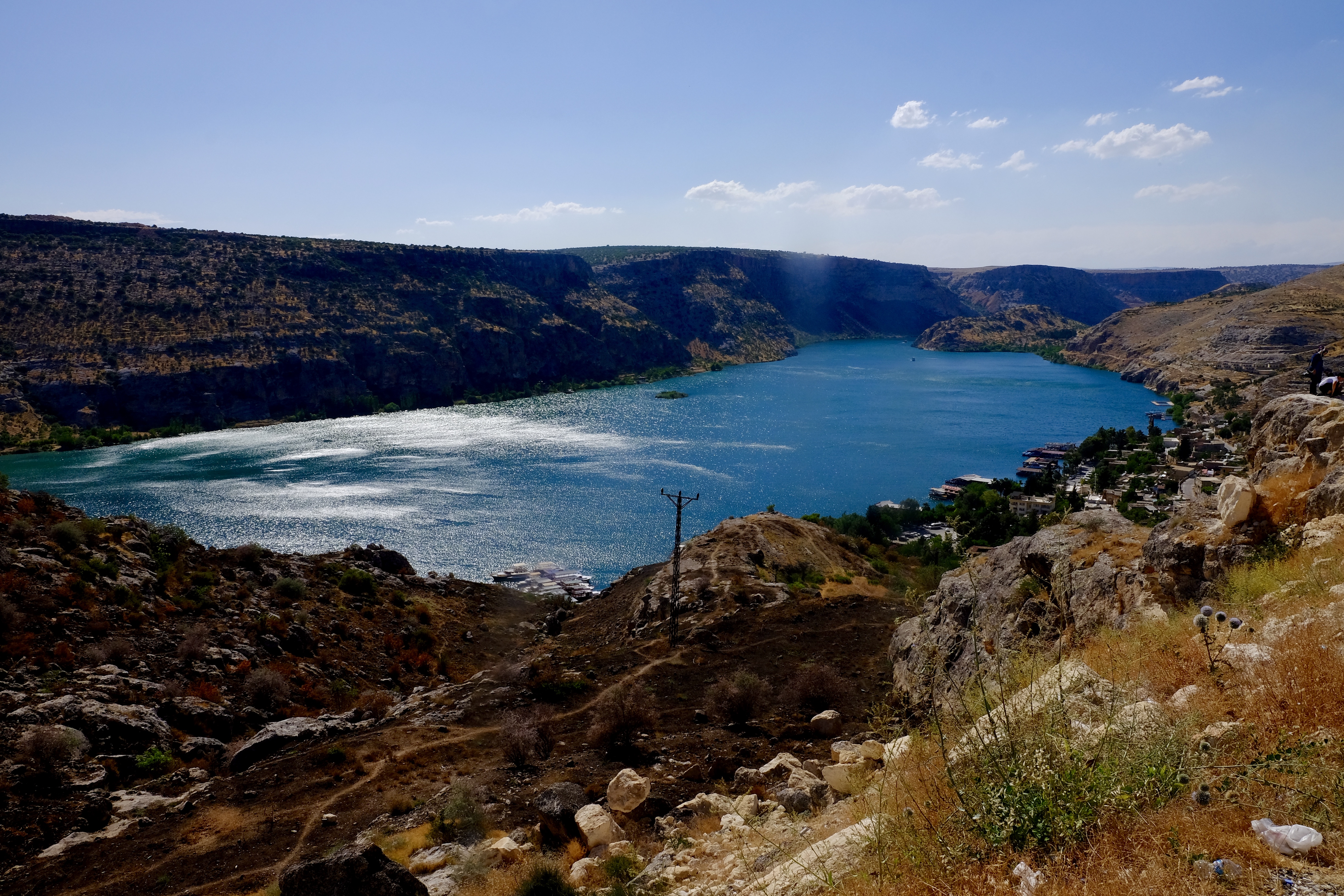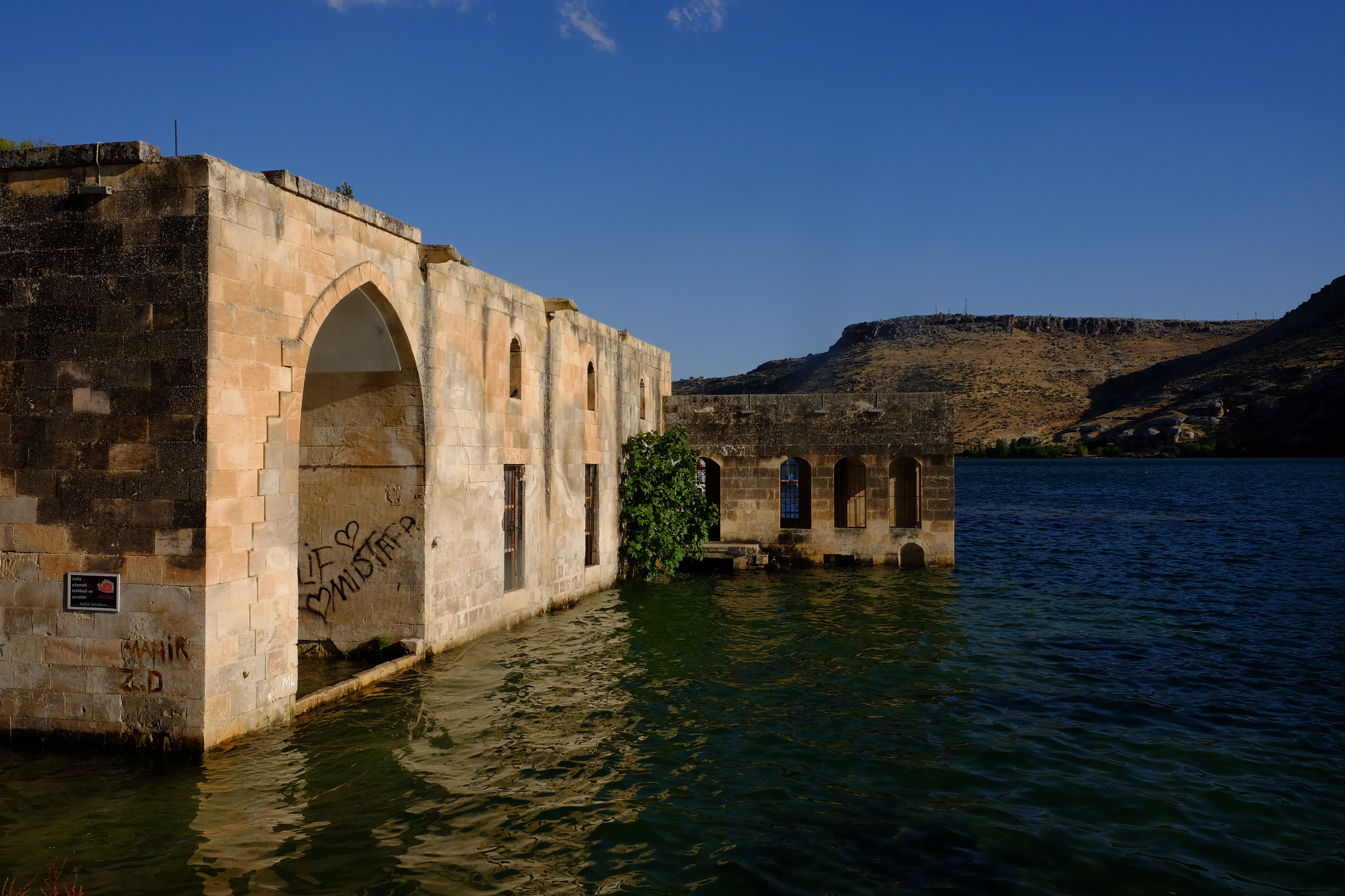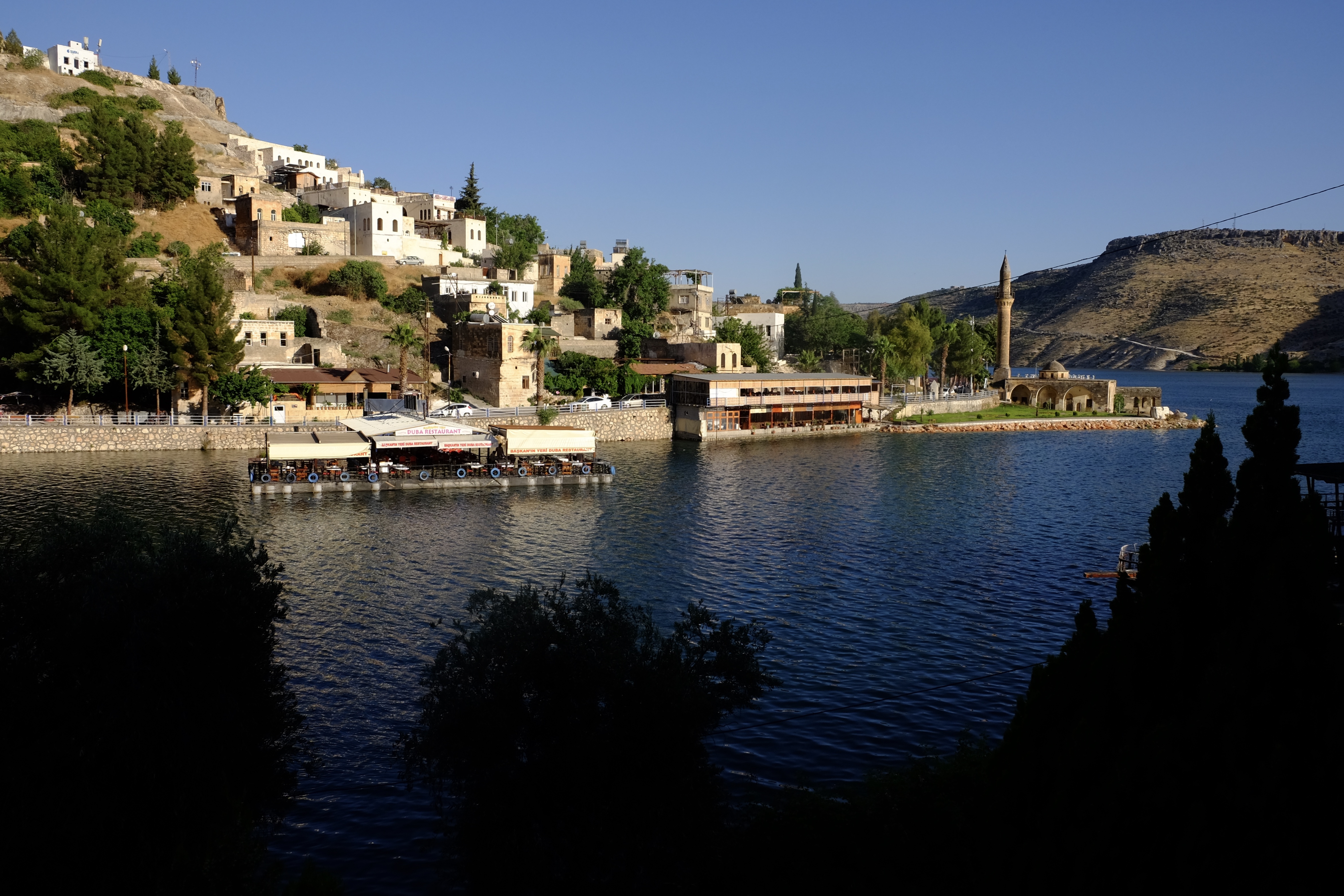 Unsere letzte Station östlich des Euphrat ist Halfeti, eine kleine Stadt am Ufer des Flusses. Das heisst, nein: Das, was von diesem Städtchen übrig ist, nachdem es 1999 zu zwei Dritteln im Stausee versenkt wurde. Heute gibt es hier eine hübsche Seepromenade, Ausflugsboote und schwimmende Restaurants. Die Hausdächer, die unter der Seeoberfläche schimmern und die alte Moschee, die knietief unter Wasser steht, wirken dennoch beklemmend. Hier wird uns die Ambivalenz der südostanatolischen Staudamm-Projekte plötzlich in ihrem ganzen Ausmass bewusst. Dieser Stausee, der den Menschen von Halfeti ihr Dorf nahm und sie zum Umsiedeln zwang, ist auch jener Stausee, der den Menschen in und um Harran erst das Wasser liefert, das zum Überleben notwendig ist.