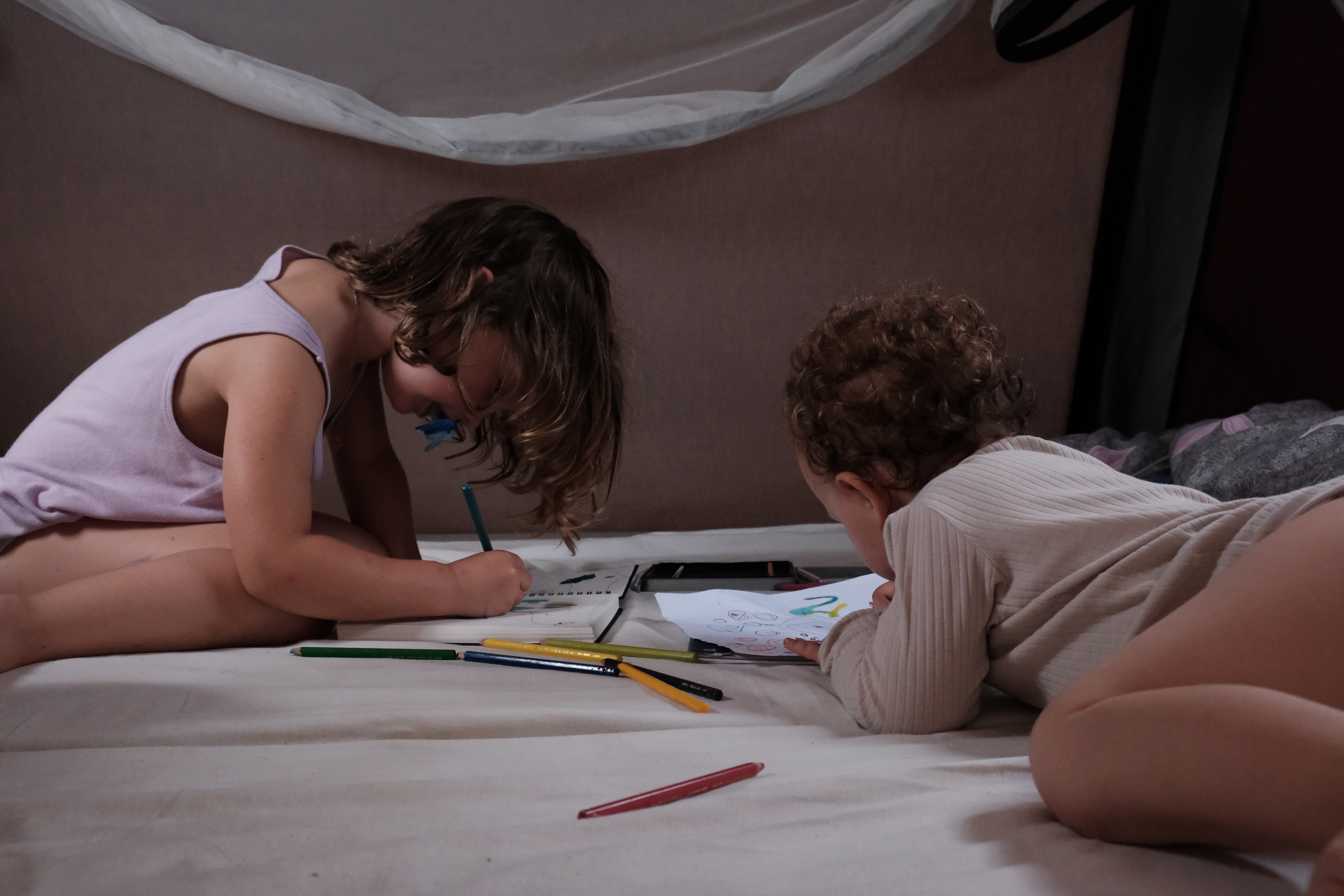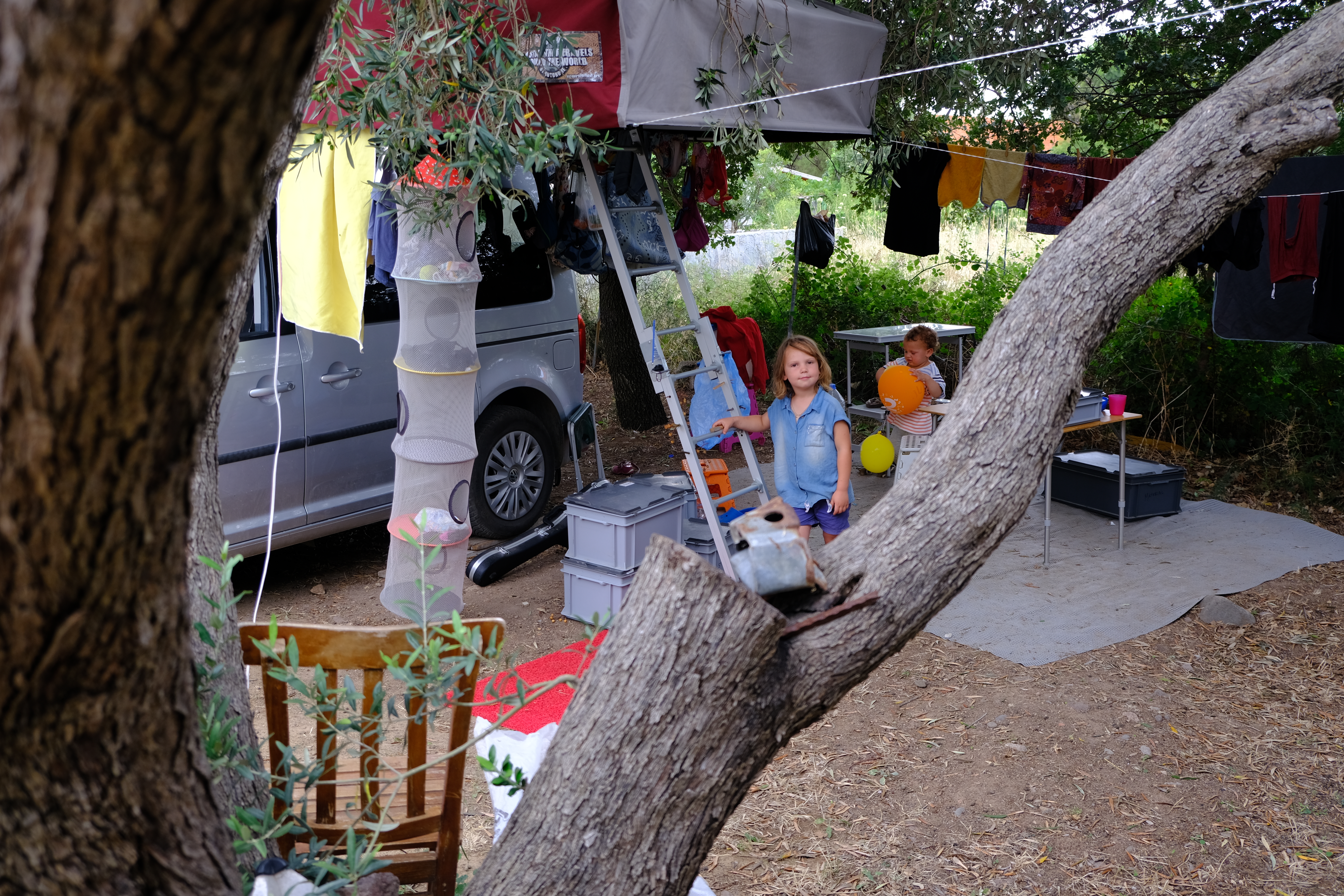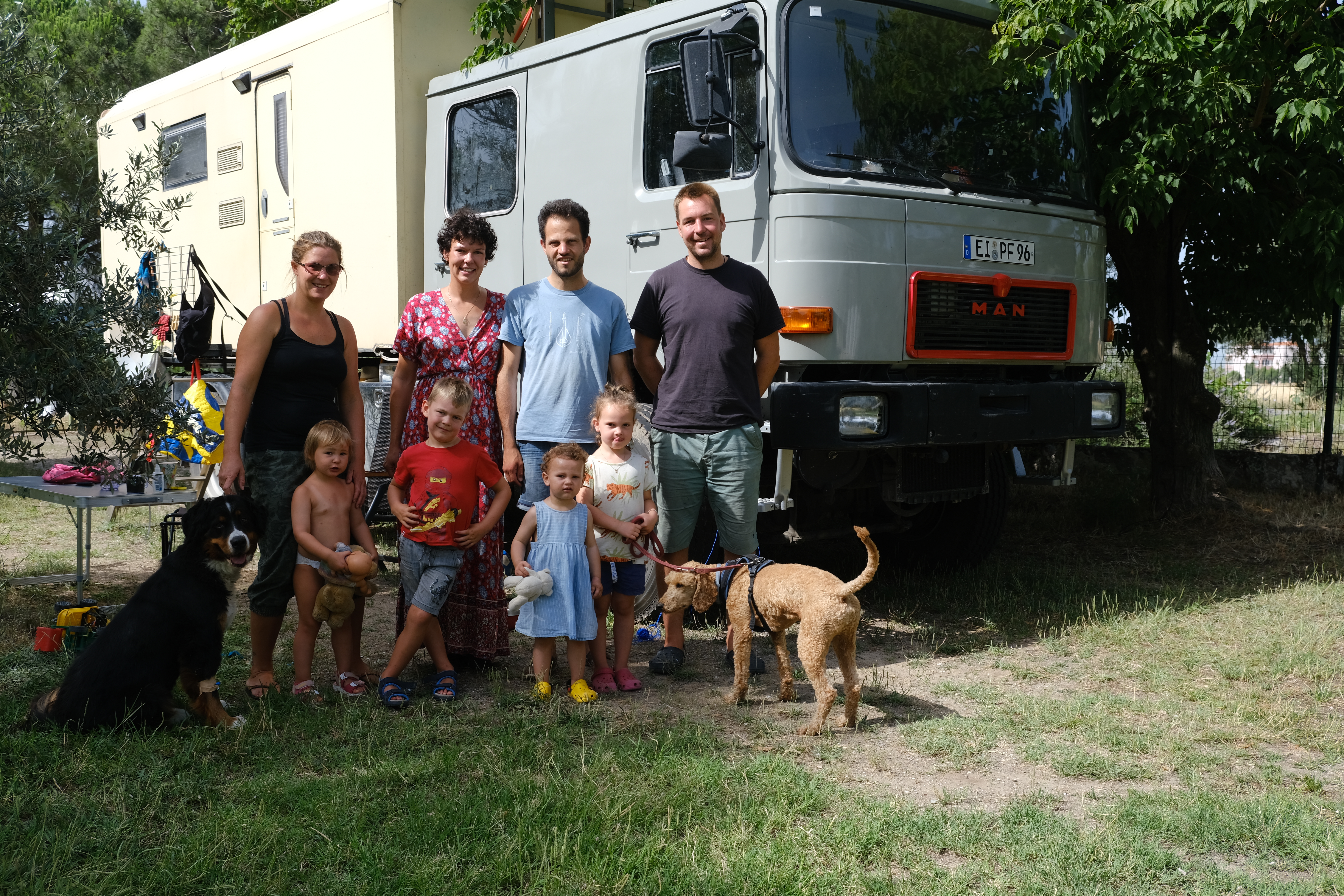 Jetzt trifft uns die südeuropäische Sommerhitze mit voller Wucht. Alles ist klebrig feucht, die Wäsche will nicht trocknen und auch die Haare nicht, und das bei über vierzig Grad. Wir retten uns in Bergama, dem antiken Pergamon, auf den Campingplatz mit Swimmingpool. Hier steht bereits ein anderes Reisemobil – ein deutscher Lastwagen, offensichtlich zum Wohnmobil umgebaut. Unser Caddy mit Dachzelt sieht daneben aus wie ein Bobbycar. Noch bevor ich huiuiui, wer ist den so unterwegs? fertig denken kann, stehen sie schon vor uns: Denis und Carina, ihre Kinder Max und Tina und die Berner Sennenhündin Sally. Sie sind die ersten anderen Touristen, die wir in der Türkei treffen – was wohl vor allem an unserer Reiseroute liegt. Die Kinder verstehen sich sofort und sind für die nächsten Tage unzertrennlich – sie spielen im Wasser, unter den Bäumen, im Lastwagen und im Dachzelt und fallen dann augenblicklich in Tiefschlaf. Und wir können währenddessen gemütlich malen, dichten, Bier trinken, grillieren und bis in alle Nacht hinein plaudern. Eine Camperbekanntschaft – das ist für uns eine neue Erfahrung. Wir geniessen die kurze Zeit miteinander ausserordentlich.