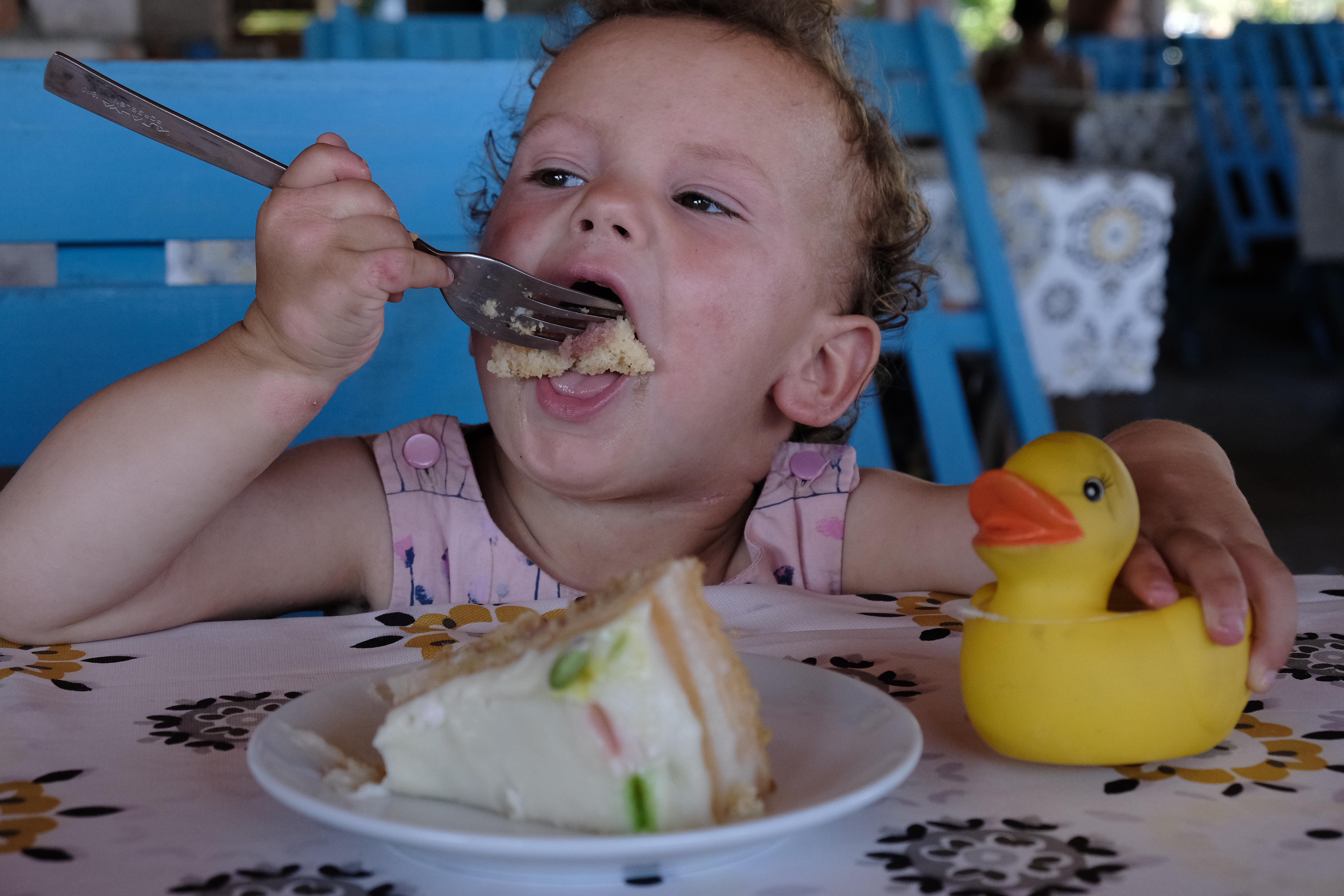 Nach den Tagen in freier Natur freuen wir uns auf Bursa – auf einen Iskender Kebap, einen Spaziergang durch die Altstadt und vor allem auf die berühmten Basare die es hier gibt. Wir freuen uns auf eine Nacht im Hotel, auf eine warme Dusche und auf ein üppiges Frühstücksbüffet. Doch daraus wird nichts. Keine Absteige und kein Luxushotel in der ganzen Stadt will uns mit unserem Milobär aufnehmen. Nachdem ein Hotelier unseren Pudel gütigerweise in der Garage hätte nächtigen lassen, ist klar: Das hier ist nichts für uns. Im kleinen Ort Gümüstepe westlich von Bursa können wir auf dem Parkplatz eines Restaurants am Fluss übernachten. Hier gibt es gutes Essen und einen Spielplatz. Und genau hier und heute lernt Rosa, das Rittiplampi, die Schaukel, selbst in Schwung zu bringen. Sie schaukelt und schaukelt und schaukelt und will gar nicht mehr aufhören.
