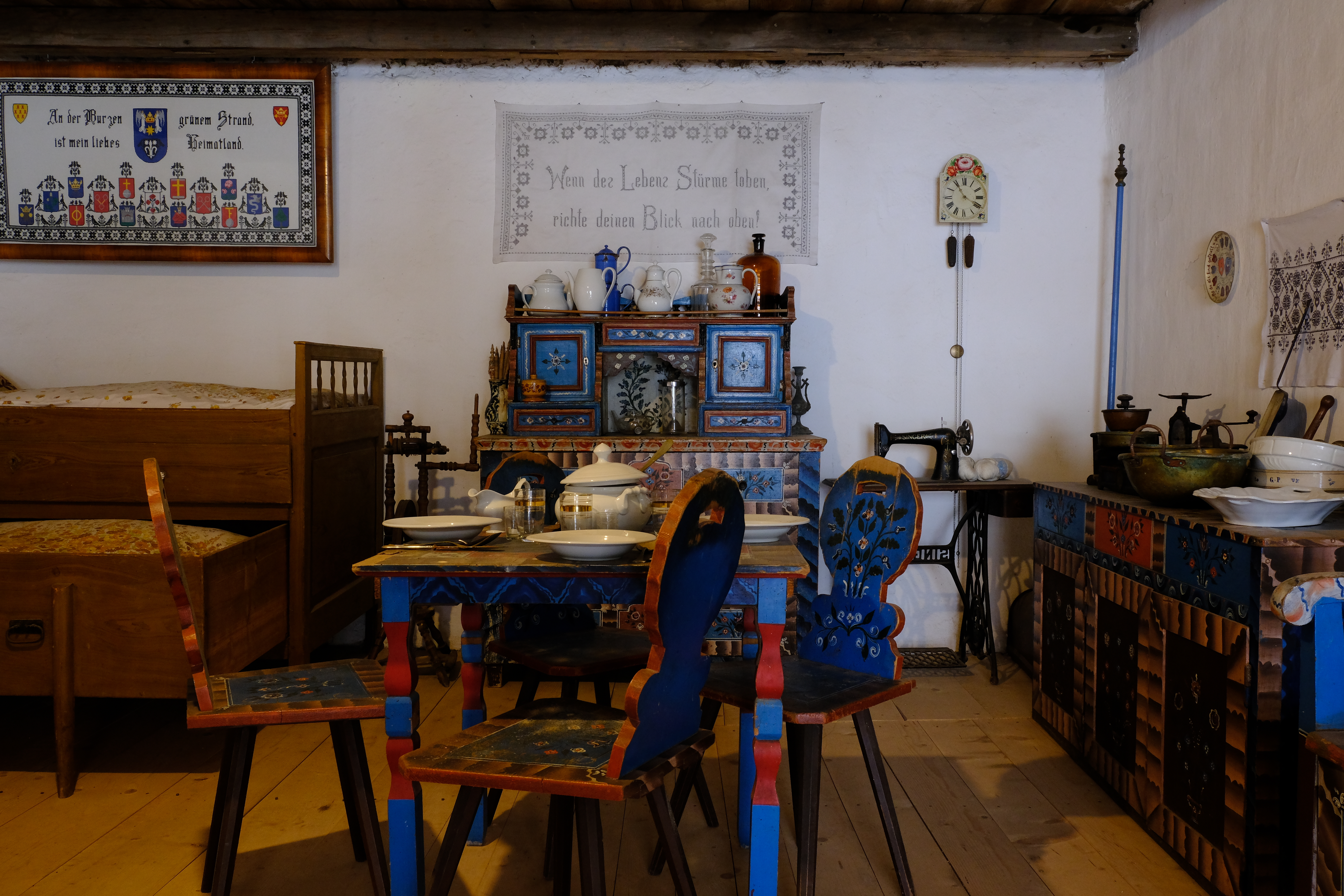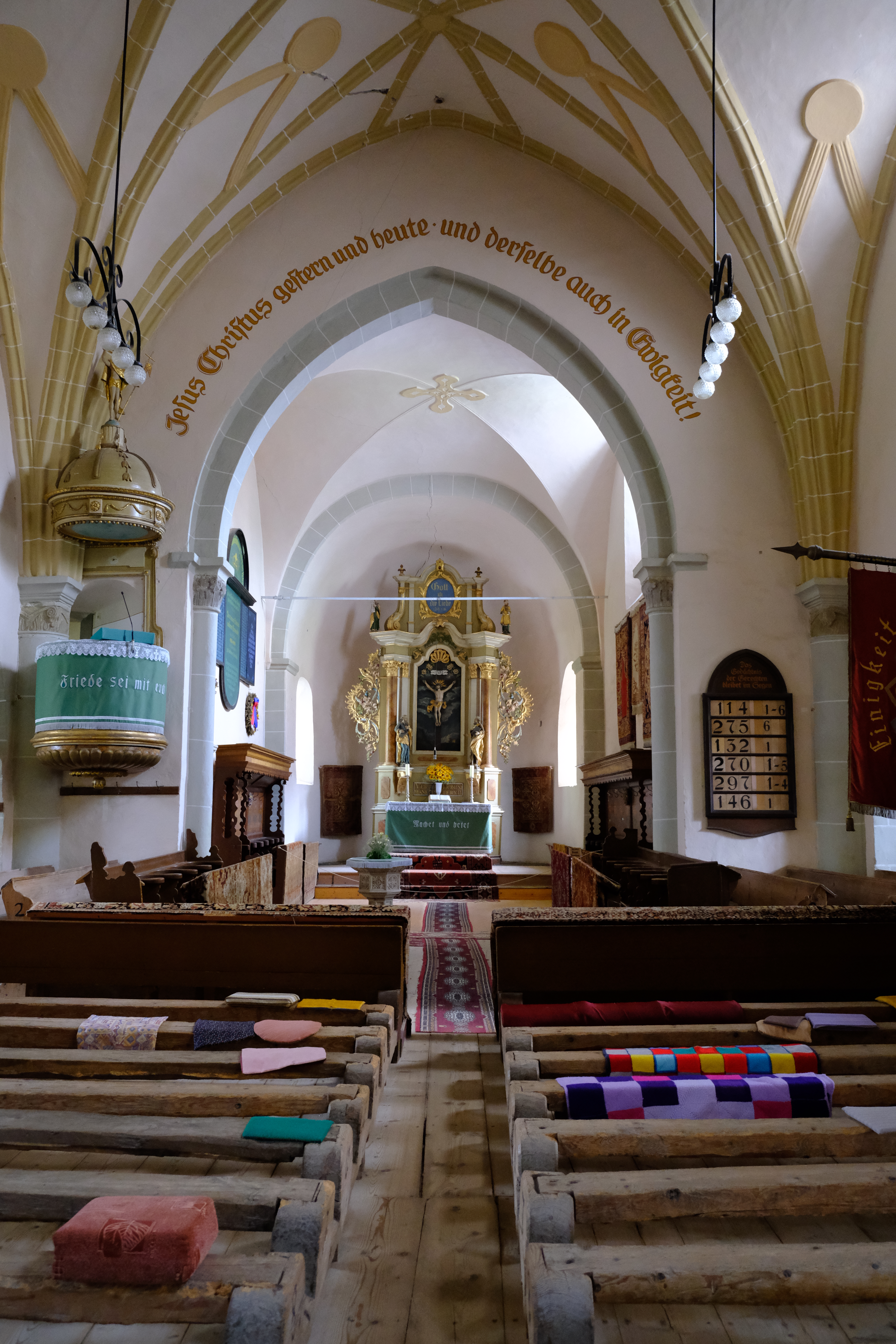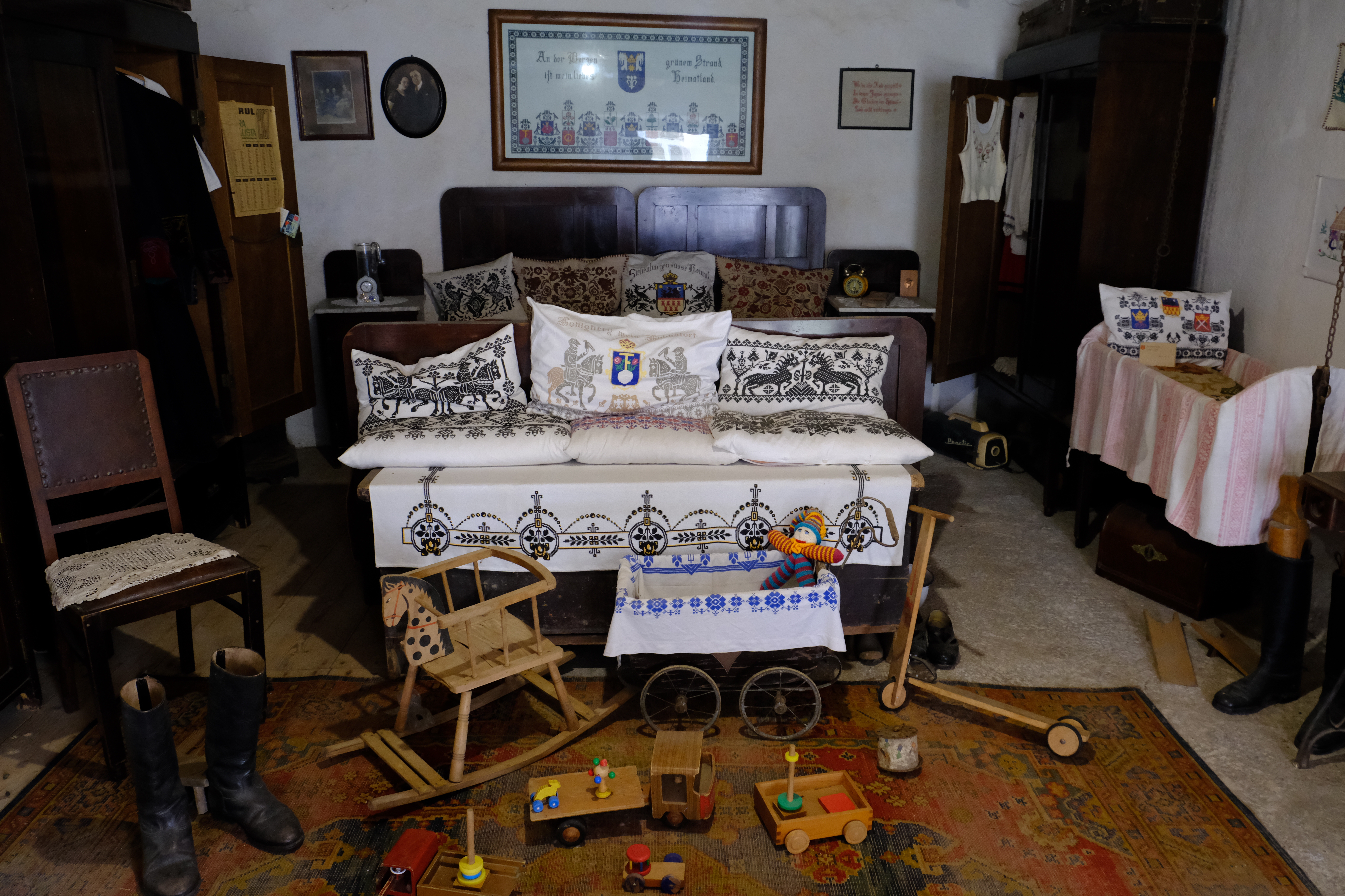 In Honigberg liegt die wohl schönste der rund 150 erhaltenen Kirchenburgen. Nur über eine Brücke gelangt man in die ringförmige Festung hinein. Wir erkunden das Innere der Mauer, die Vorratsräume und das kleine Museum – nein, ihr dürft nicht aufs Bett klettern! Die Siebenbürger Kirche wurde im 16. Jahrhundert Teil der Reformation und ist bis heute evangelisch. Gut für uns: In den Kirchenbänken liegen deutsche Gesangbücher auf, und Daniel und ich singen, bis Rosa findet, es sei jetzt genug, sie wolle auf den Turm. Über schwindelerregende Treppen klettern wir bis ganz oben. Nach diesem Burgabenteuer sind Rosa und Stella zum umfallen müde, und wir haben alle einen Bärenhunger. Zum Glück gibt es gleich hinter der Burgmauer eine Pizzeria.