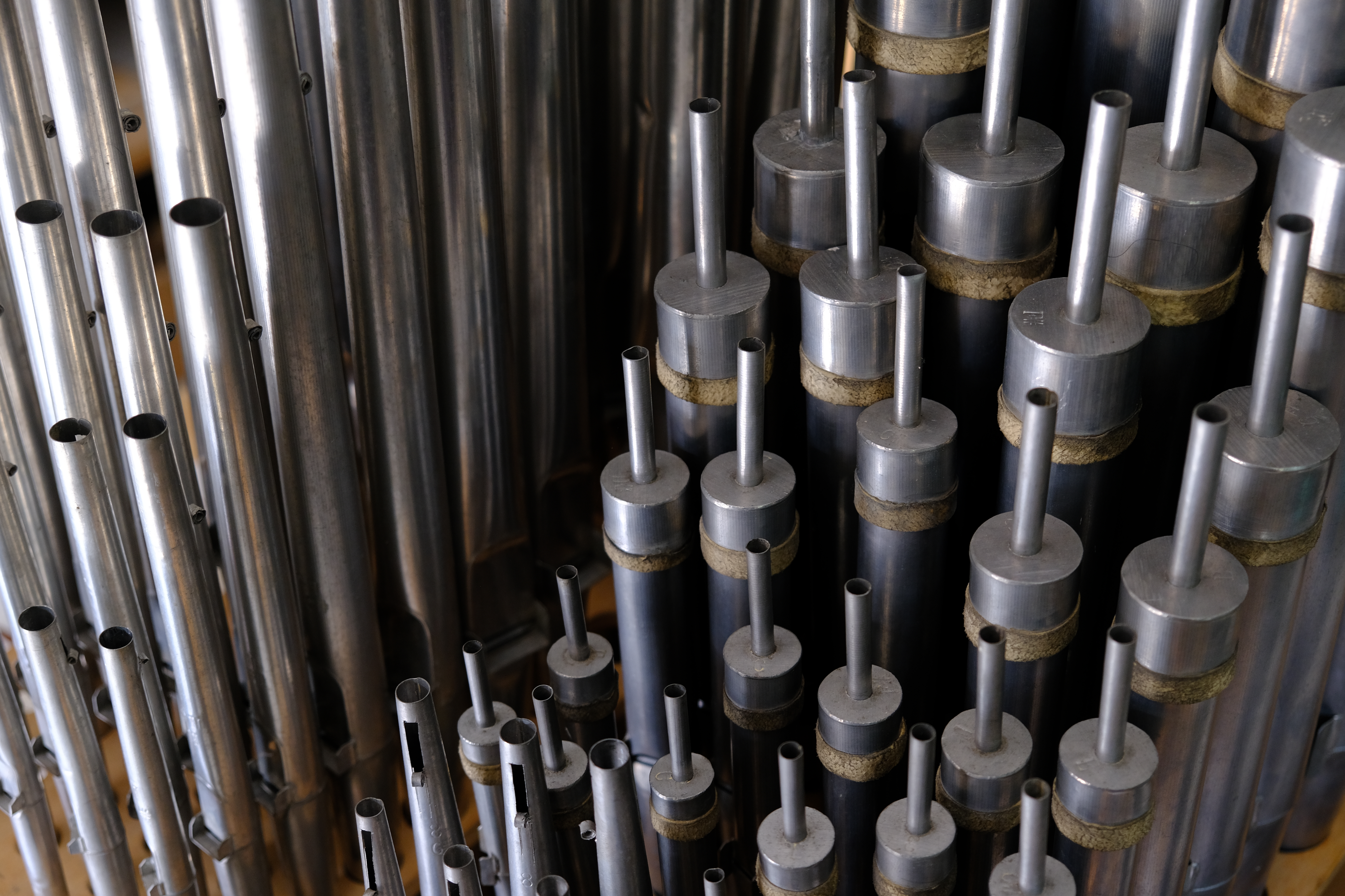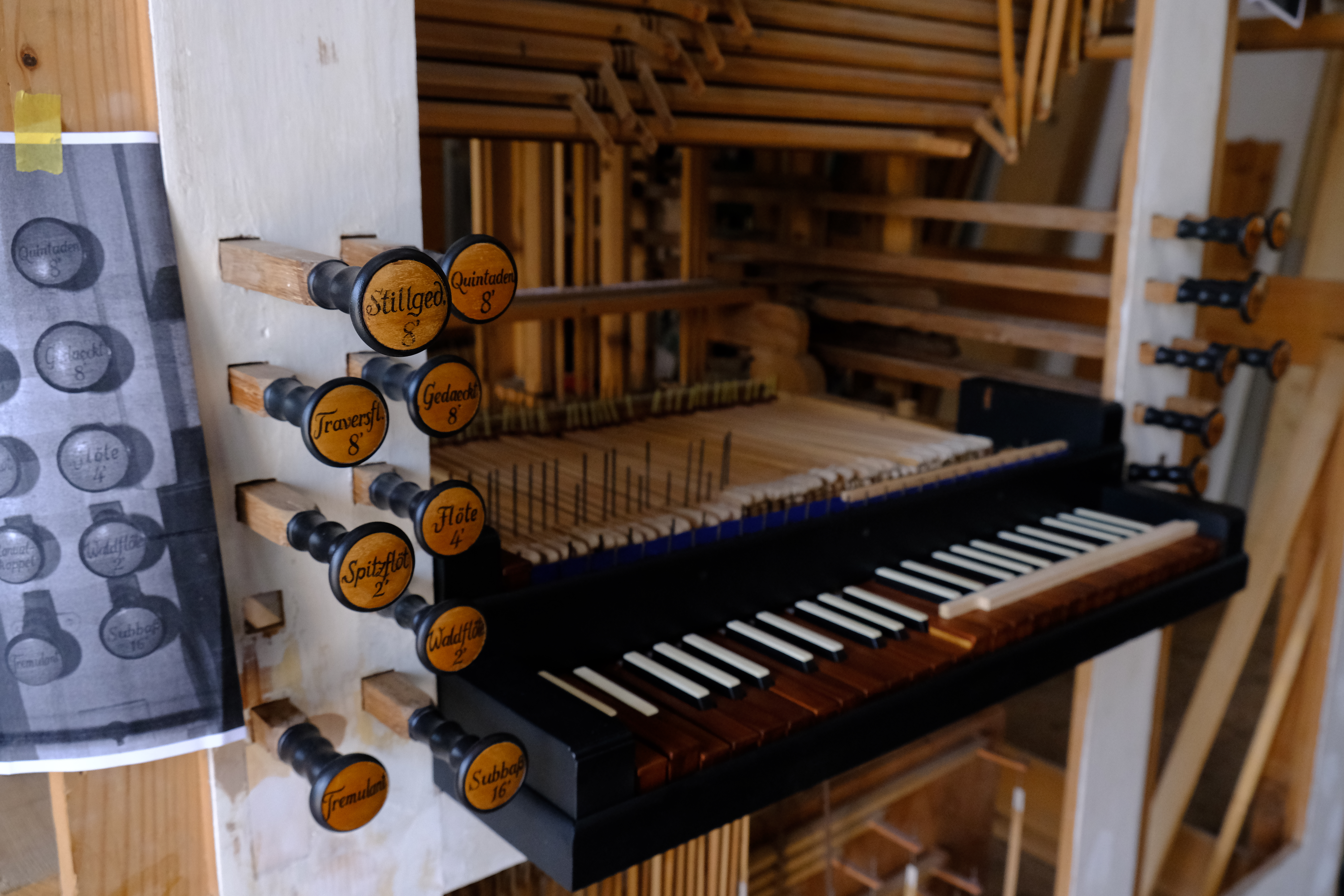 Das Instrument steht da, in seine Einzelteile zerlegt, aber immer noch imposant. Alte, bemalte Holzteile lehnen an der Wand, eine Tastatur liegt auf dem Tisch und Metallpfeifen stehen nach ihrer Grösse geordnet in einem Holzkasten. Ein junger Mann klettert mit dem Meter im Orgelgerüst herum und passt konzentriert die fehlenden Teile ein.